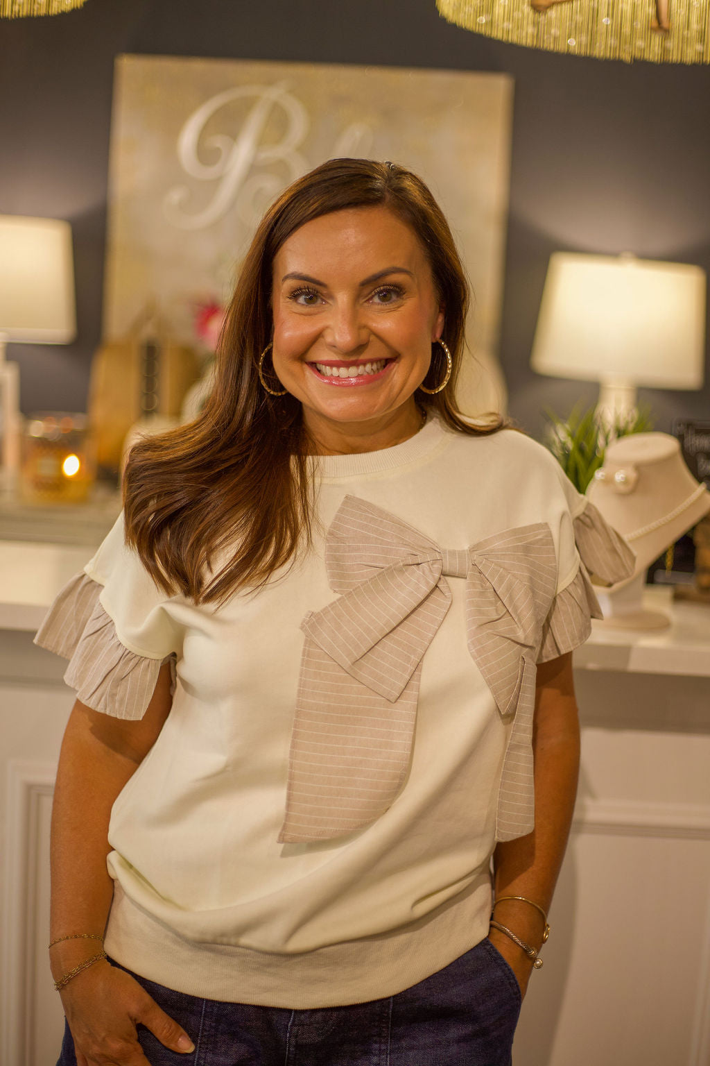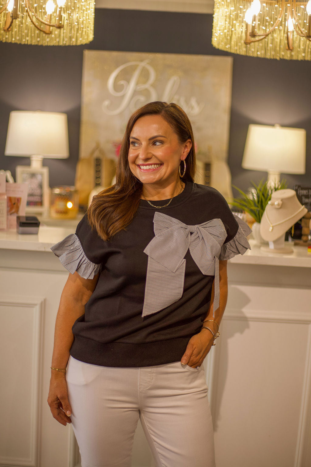This Bennet Bow Top brings a playful twist to your wardrobe with its soft mineral-washed French terry fabric and charming pinstripe print. Featuring a cute bow and delicate ruffle details, it’s perfect for adding a flirty touch to your everyday look. Imported and available in sizes S to XL, it’s a fun and comfy choice for any casual occasion.