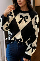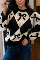 Add a fun twist to your wardrobe with the Bow 2-tone Sweater by Aapparella. Featuring a playful black and white rhombus and bow print, this oversized long-sleeve sweater offers cozy comfort with a stylish edge. Its relaxed fit makes it perfect for layering or lounging with flair.