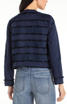A chic, refined jacket that pairs timeless sophistication with subtle modern details. The collarless design offers a sleek, minimalist look, while frayed edges and lace trim add texture and femininity. This versatile piece is perfect for layering over casual or dressier outfits, bringing a touch of elegance with ease. Ideal for transitioning between seasons, this jacket is a staple for any wardrobe.