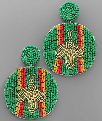 These Green/Multi Bee & Stripe Beaded Earrings combine intricate beadwork with a distinctive bee and stripe design, showcasing expert craftsmanship. The carefully selected color palette enhances versatility, making them a refined accessory that elevates both casual and formal ensembles. Lightweight and durable, they offer comfort without compromising style.