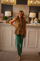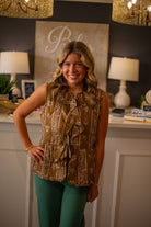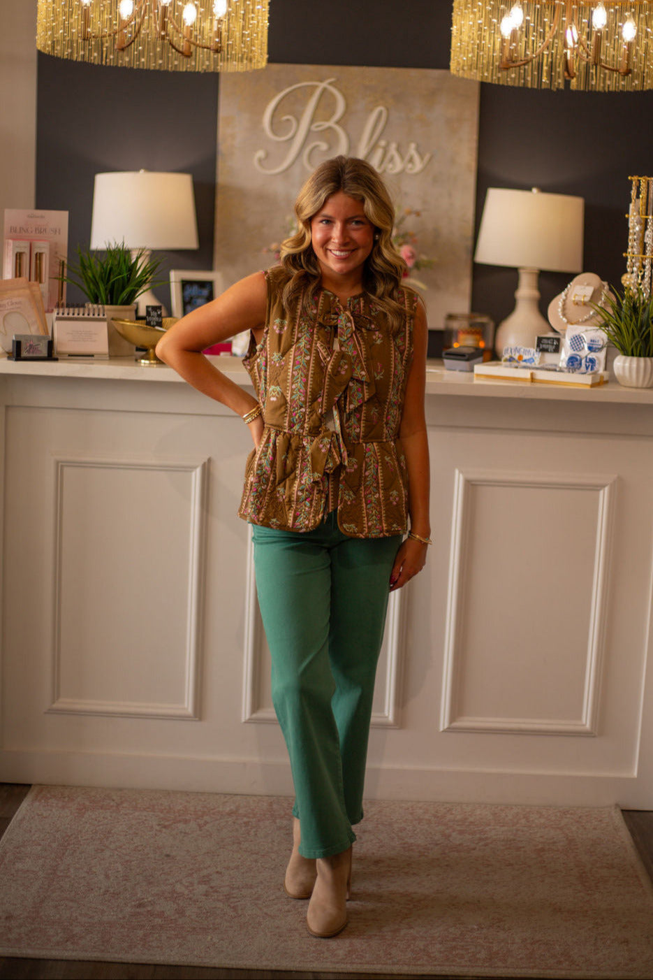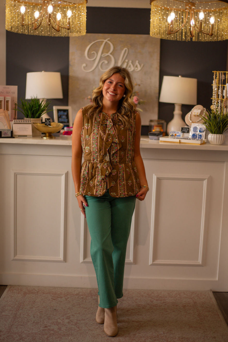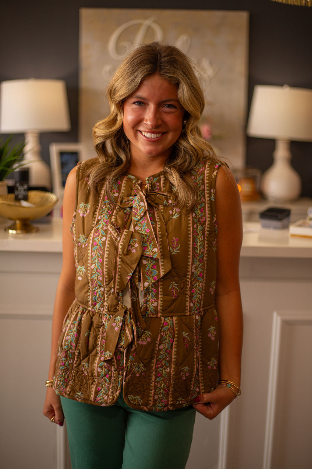 Botanical Print Sleeveless Peplum Vest with Front Tie Bows