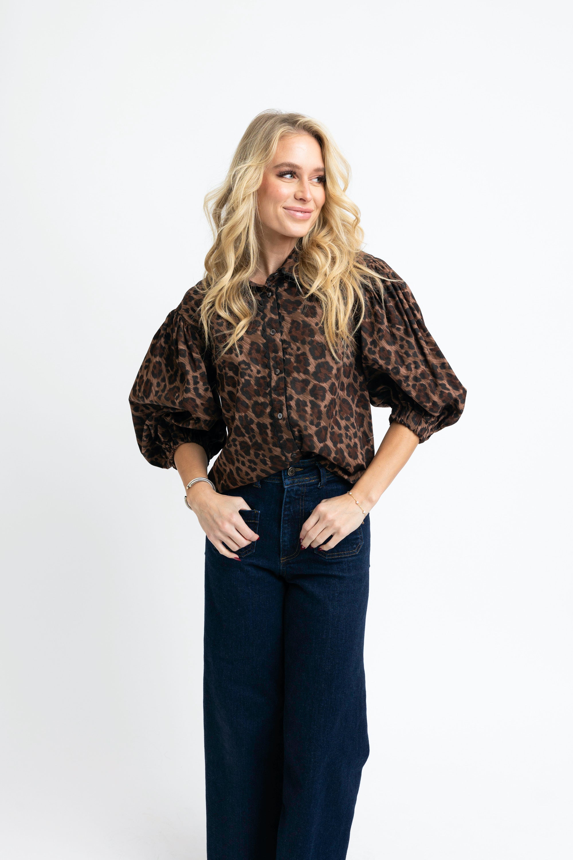 Turn heads with this chic button-up top featuring a playful leopard print and eye-catching ric rac detailing. The voluminous puff sleeves add a touch of drama, while the tailored fit ensures a flattering silhouette. Made from soft poplin fabric, it combines comfort with bold sophistication. Perfect for pairing with jeans or skirts, it’s a standout piece that effortlessly transitions from day to night.