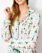 Wrap yourself in holiday cheer with this soft, button-front sleep top designed for ultimate cozy nights. The playful seasonal print adds a whimsical touch, while classic piping, a relaxed fit, and a chest pocket bring timeless pajama charm. Perfect for slow mornings, warm cocoa evenings, and every festive moment in between.