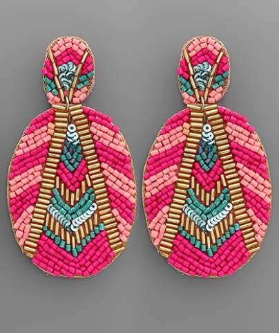PINK/TQ Chevron Pattem Beaded Oval Earrings