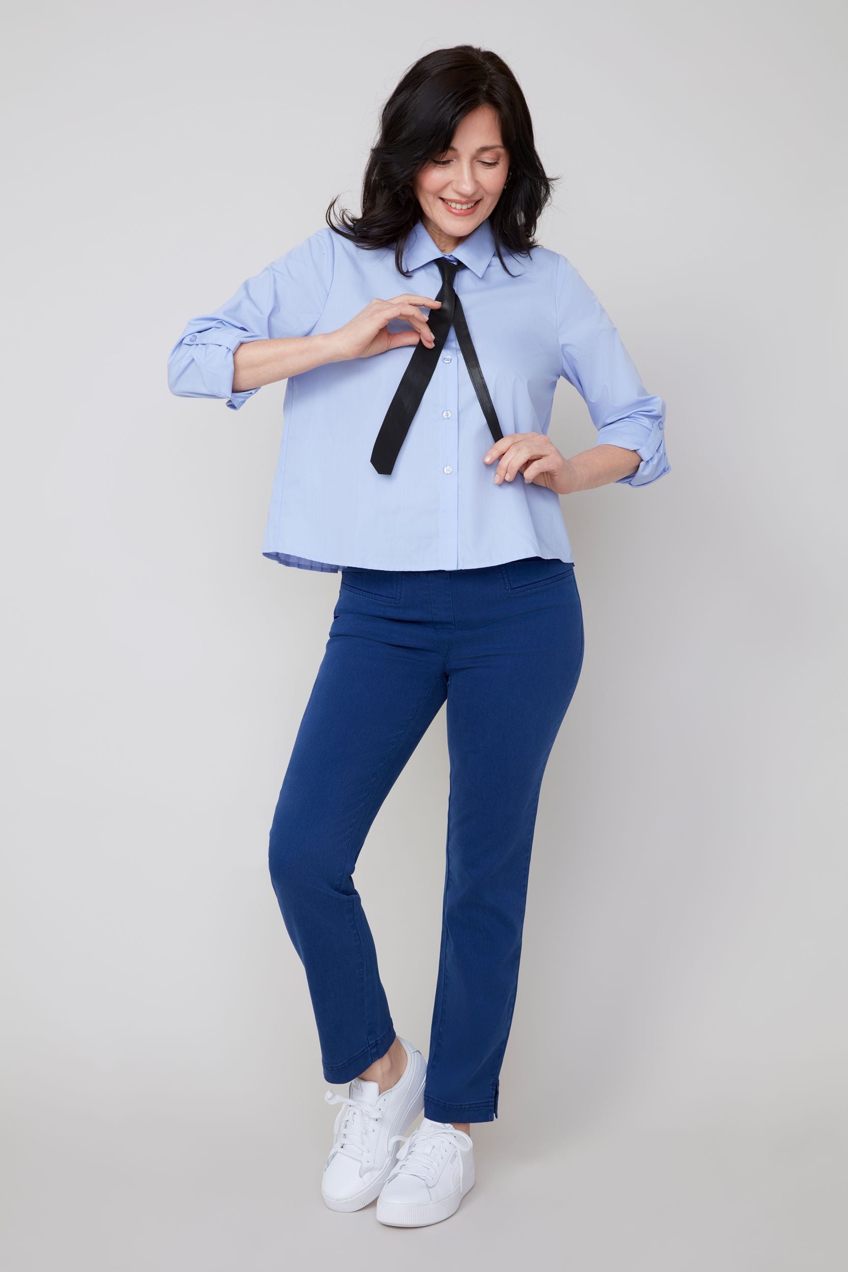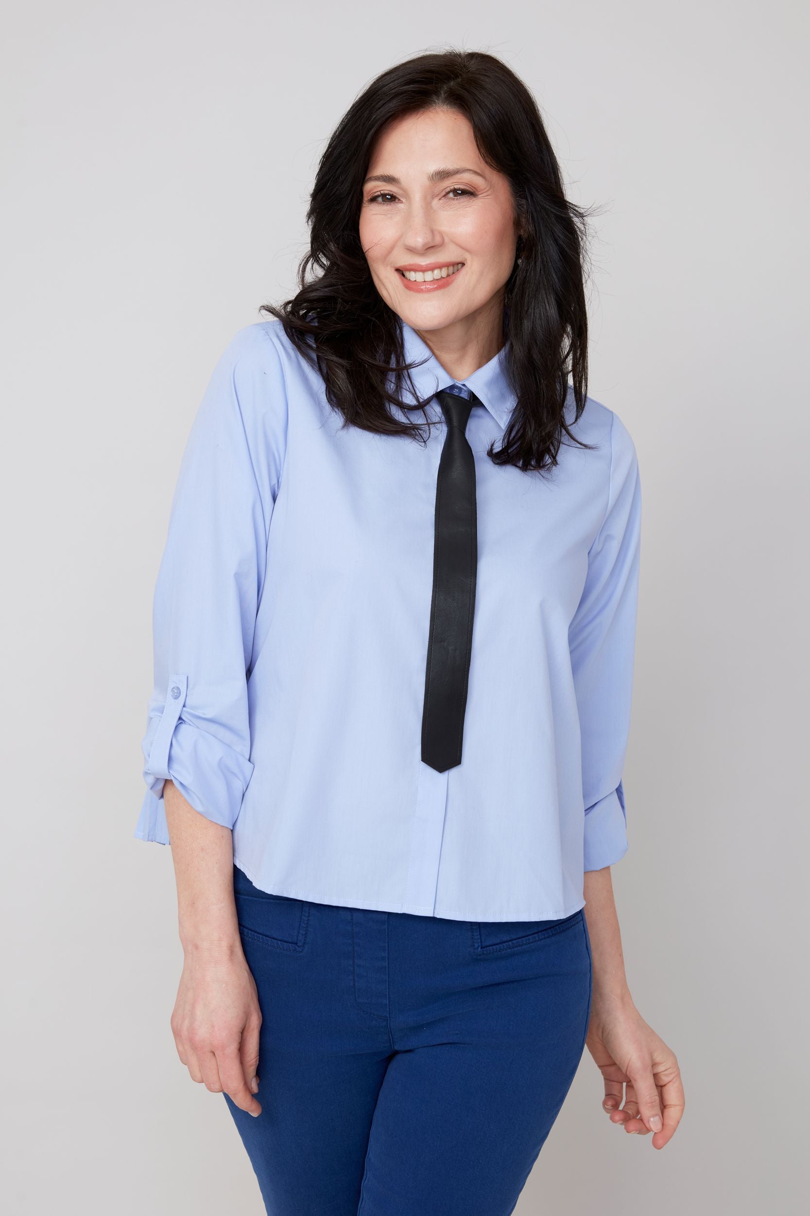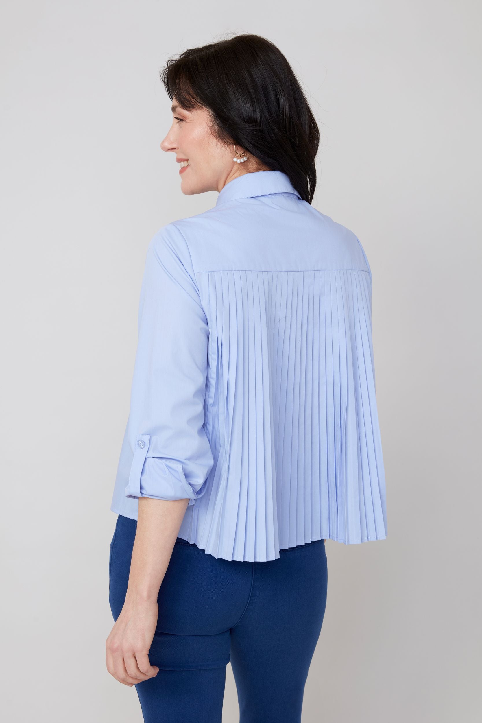 A sleek silhouette from the front meets fluid elegance at the back with this striking shirt. The detachable tie adds a hint of edge, while the finely pleated panel flows effortlessly, bringing soft movement to your look. Designed for versatility and style, this piece transitions seamlessly from desk to dinner with modern grace.