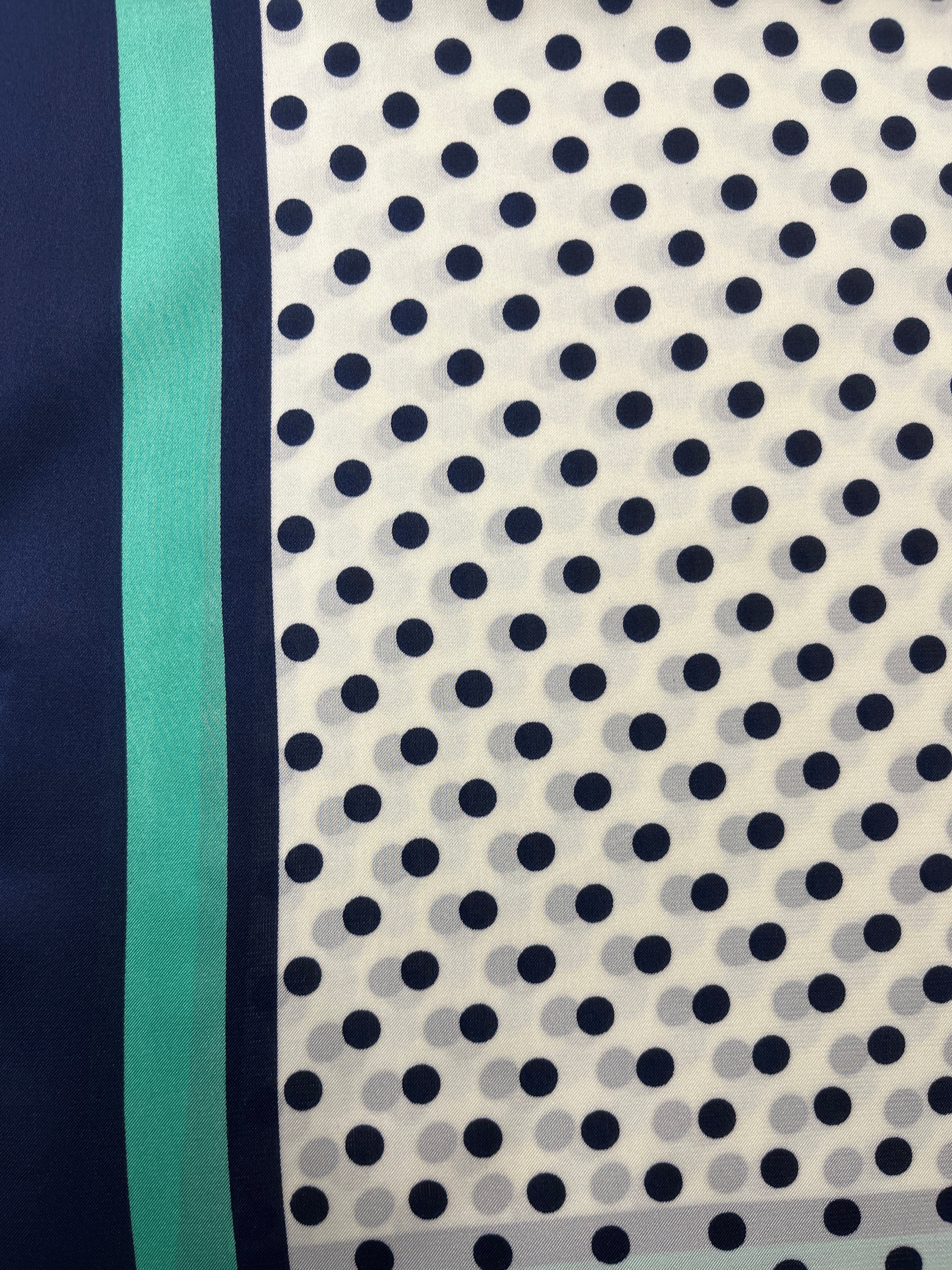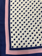 Add a playful yet sophisticated touch to your look with a scarf featuring a bold polka dot pattern on a light backdrop. Framed by vibrant borders, this design blends retro charm with a contemporary edge. The perfect accessory to bring a modern flair to any outfit.