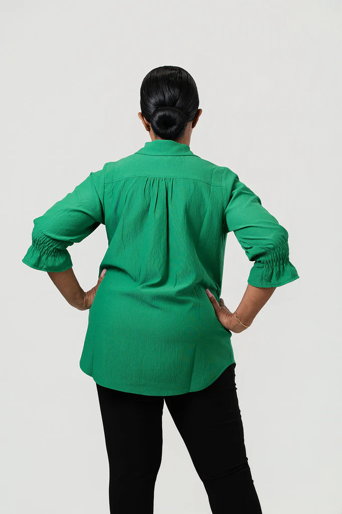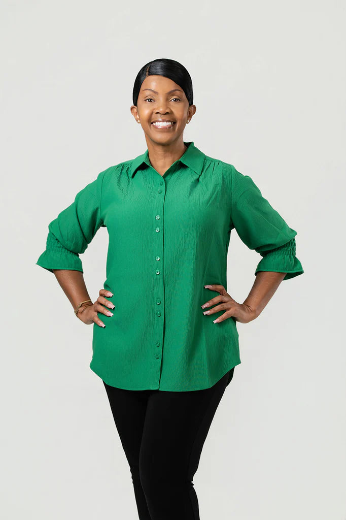 Elevate your look effortlessly with this playful emerald button-front blouse. Its crisp collar and smocked cuffs add a fun twist, while the flattering fit lets you transition from laid-back denim days to polished office vibes with ease. Crafted for comfort and style, it’s your new go-to for mixing and matching with a splash of charm.