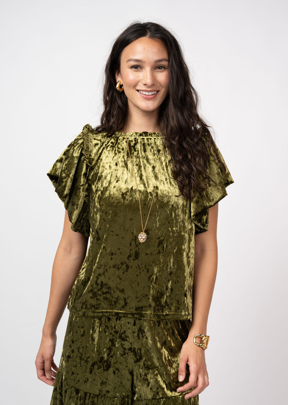 This luxurious velvet top brings elegance and drama to any wardrobe. The rich, soft fabric offers a beautiful sheen, while the flounce sleeves add a playful yet sophisticated touch. The relaxed fit and gathered neckline create a flattering silhouette that’s both comfortable and chic. Ideal for pairing with jeans, skirts, or tailored pants, this versatile piece transitions easily from day to night, making it a perfect choice for both casual and dressier occasions. It’s an effortless way to bring a touch of glamour to your everyday style.