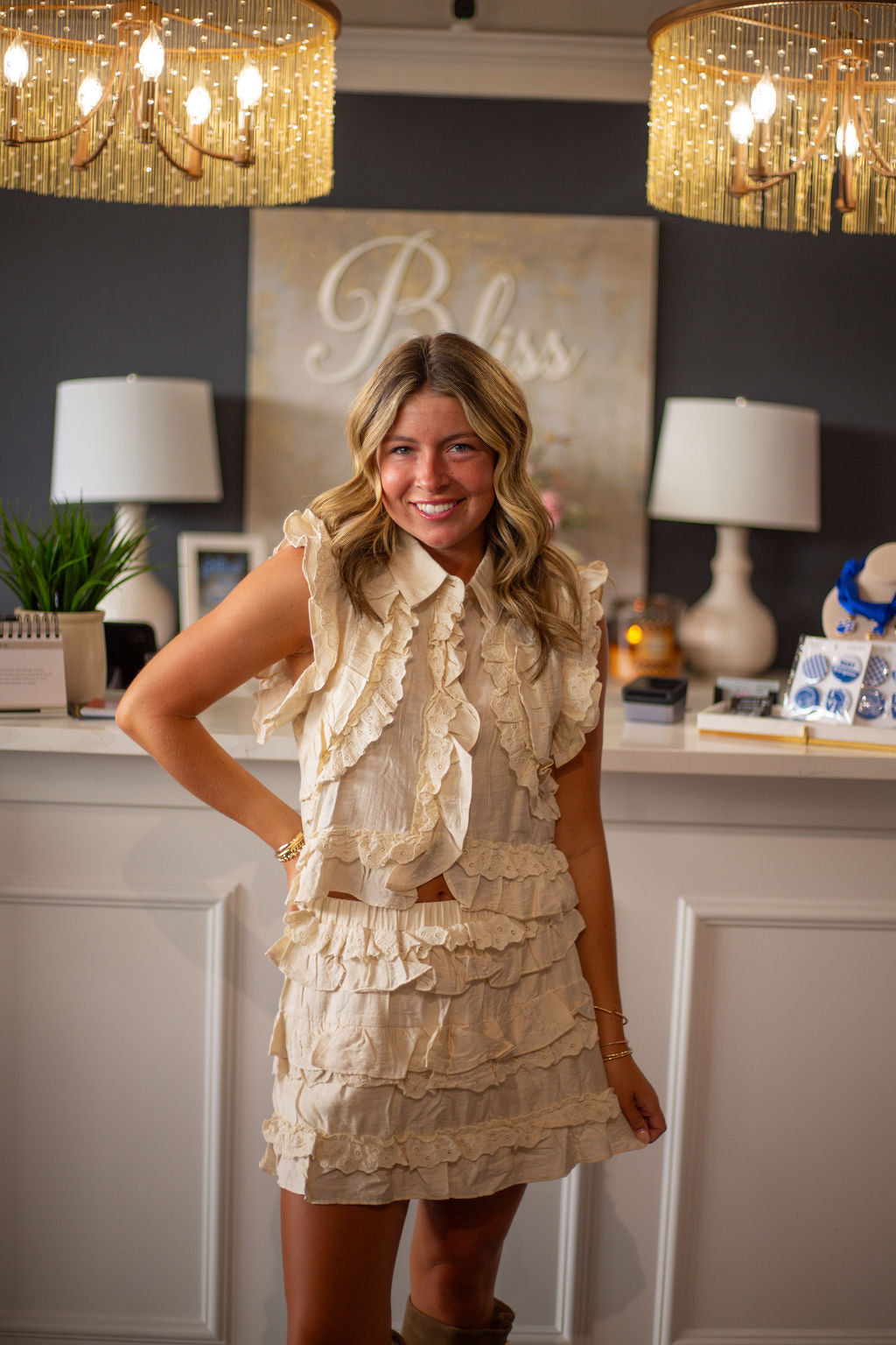 Layered Ruffle Eyelet Trim Detail Crop Top and Skort Set