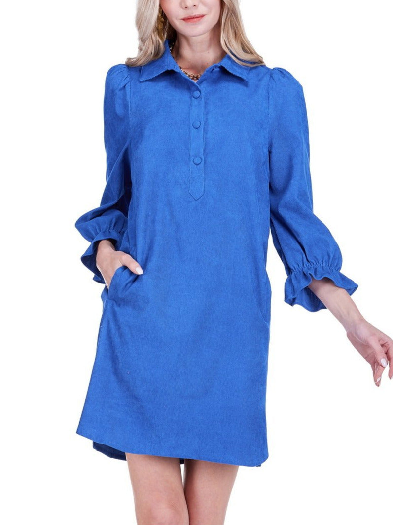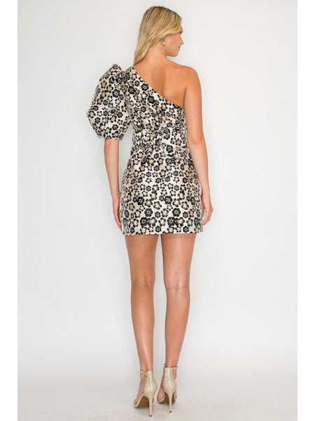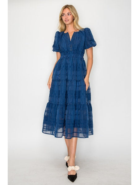Windowpane Jacquard Puff Sleeve Midi Dress
