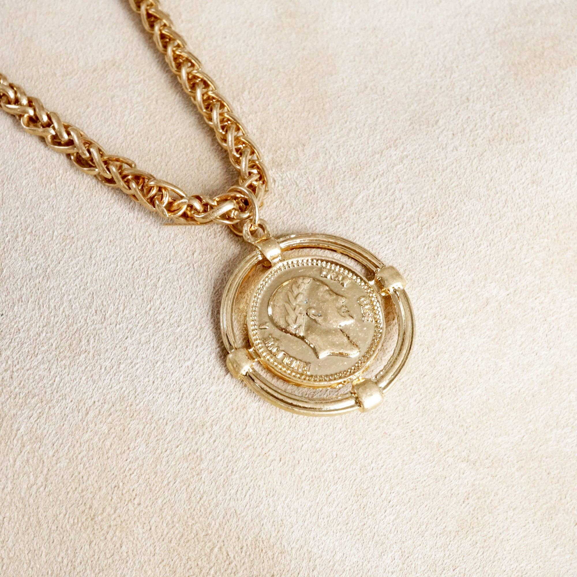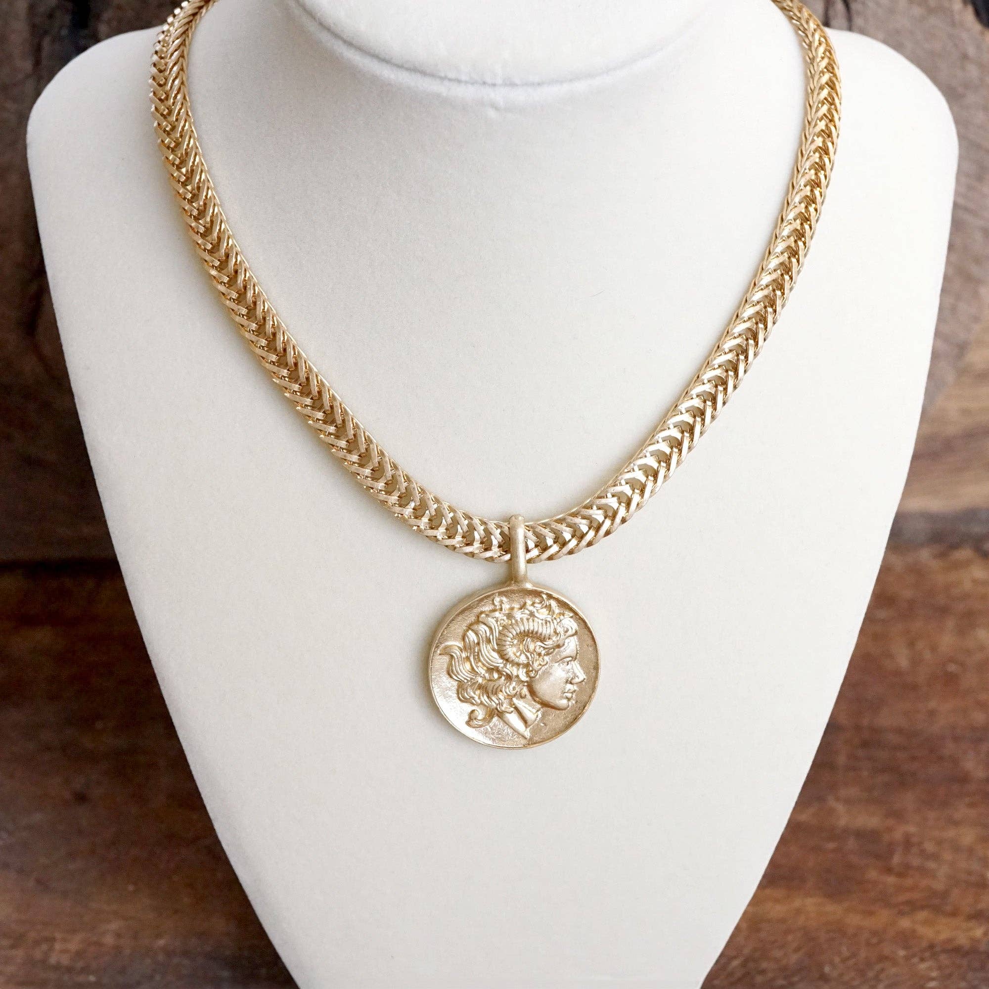 Framed Coin Necklace with Worn Gold-Tone Wheat Chain