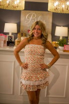 Get ready to turn heads with Grandma's night out multi-coral short tube top dress. This playful dress features a white base adorned with abstract coral colored flowers, and is sure to brighten up any night out. With 3 eye-catching tiers, including one with charming eyelet details, you'll feel simultaneously flirty and fun in this quirky number. (And your grandma will approve!)