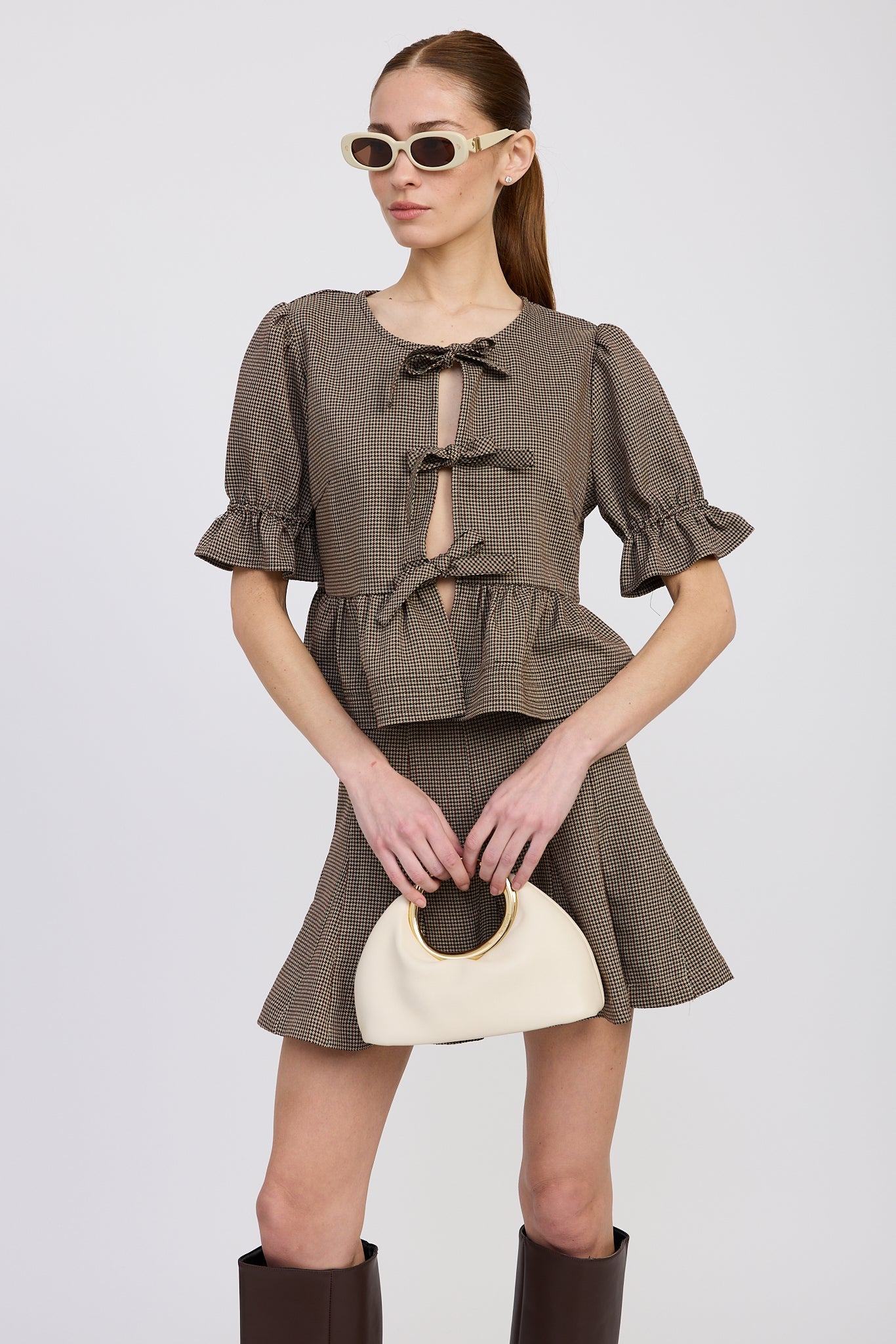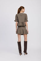 The mini skirt is designed with a flattering high-waist fit and a gently flared silhouette that creates effortless movement. Its tailored structure adds a polished touch while keeping the look playful and versatile. A timeless set that adds chic sophistication to any wardrobe.