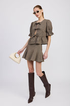 The top brings a playful yet refined touch with its bow-tie front detailing and keyhole accents. Designed with short puff sleeves and ruffled cuffs, it offers a feminine silhouette that’s both structured and relaxed. The peplum hem adds a flattering shape, creating effortless movement and style.