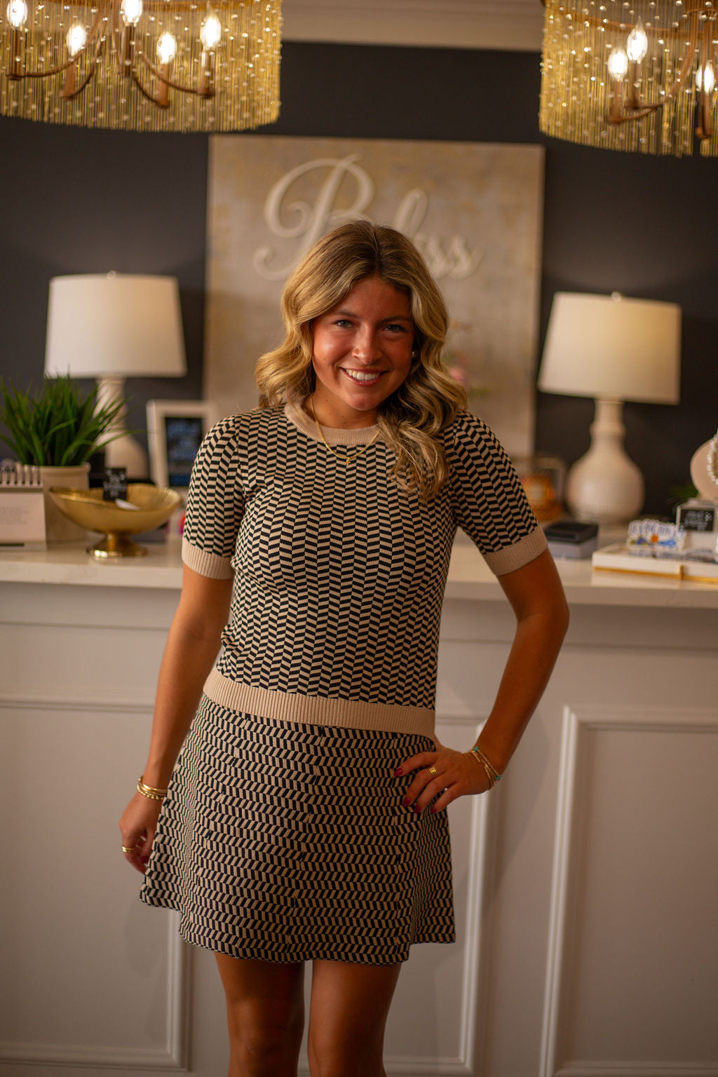 Elevate your wardrobe with the Warren Knit Top and Skirt Set by Lucy Paris. This sophisticated ensemble features a geometric design and a short-sleeve, slightly cropped top accented with tan trim that beautifully complements the matching mini skirt. Perfectly balanced for style and comfort, this set offers a polished look ideal for both casual outings and refined gatherings.
