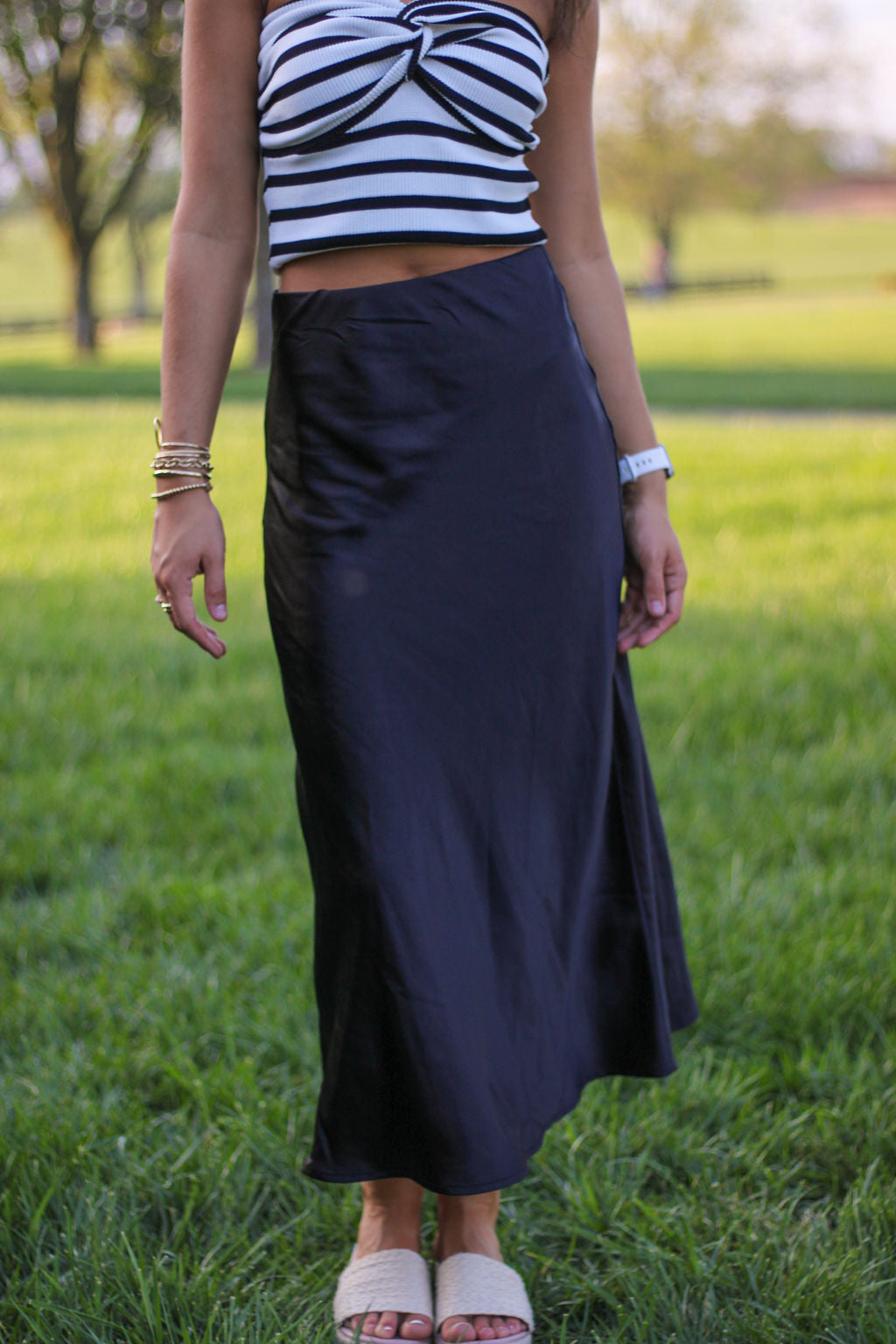 Introducing our Sleek Satin Skirt- the perfect addition to any wardrobe. Its chic silhouette flatters your figure, while its versatility allows for endless styling options. Dress it up with a sweater and heels or keep it casual with a tee and sneakers. This best seller is a must-have basic for any closet, offering endless possibilities for any occasion.
