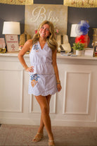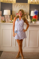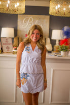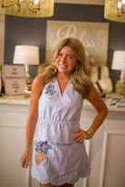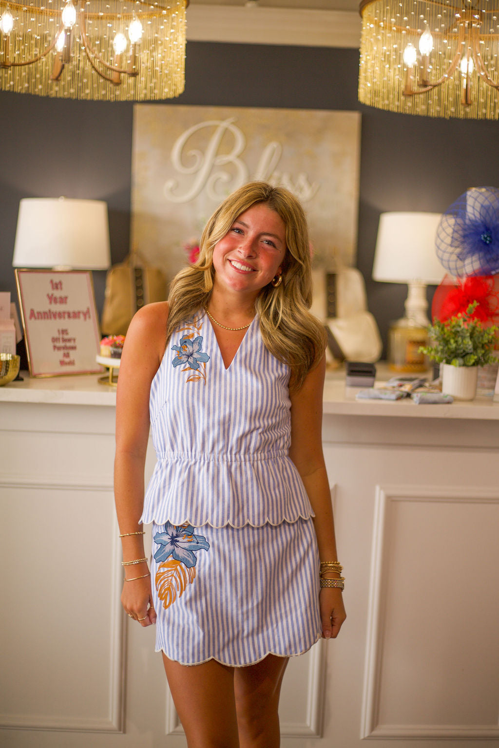 Dress to impress with our Tahiti Top and Cannes Skort Set. The blue and white stripes will make you stand out while the comfortable and stylish design will keep you feeling confident. The intricate details such as the tie back with beads and applique on both the top and skort make this set truly unique. Be prepared to turn heads with this one-of-a-kind outfit.