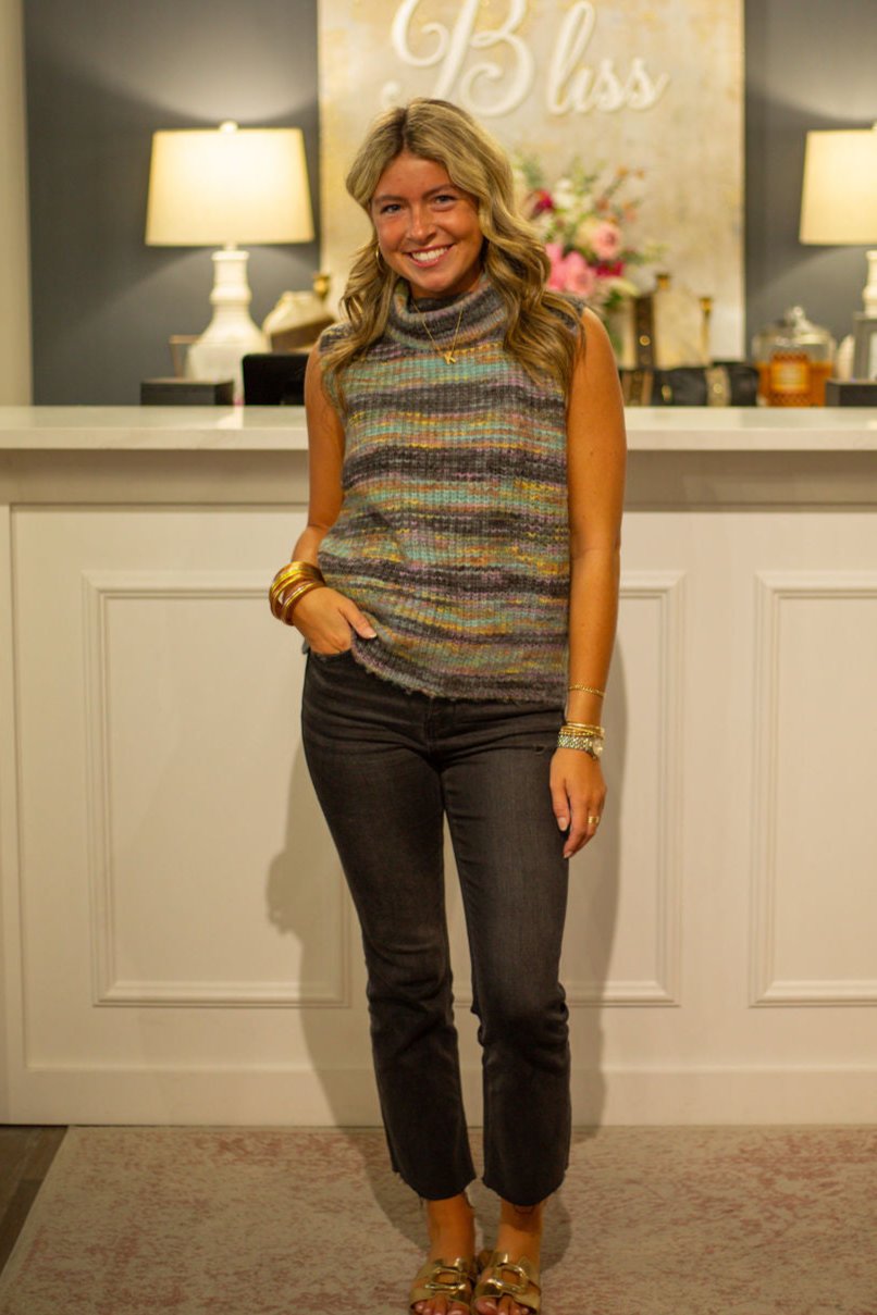 Ladies Knitted Sleeveless Sweater Grey with Multi-Colored Stripe