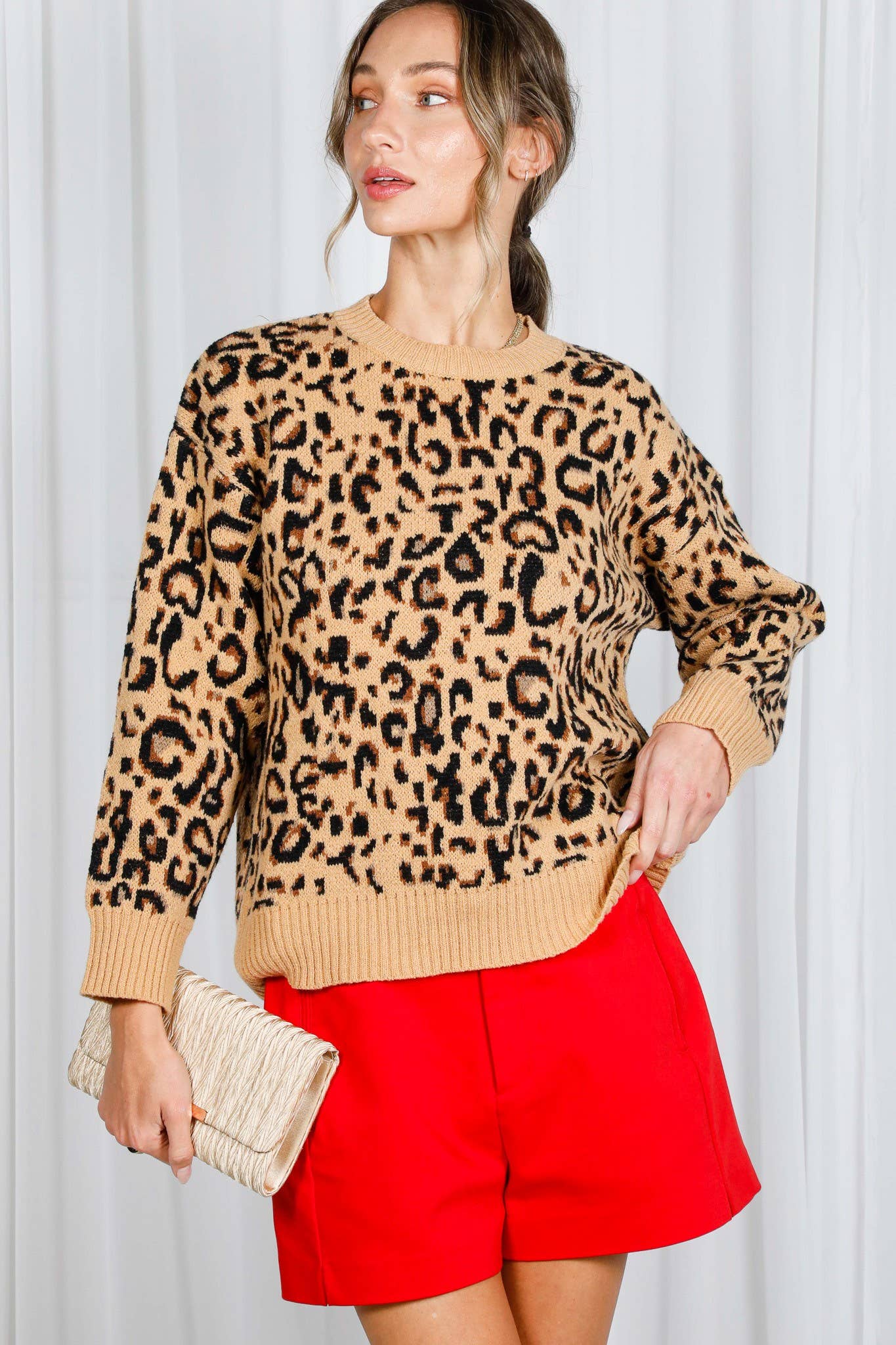 Leopard Design With Contrasting Trim Jacquard Sweater