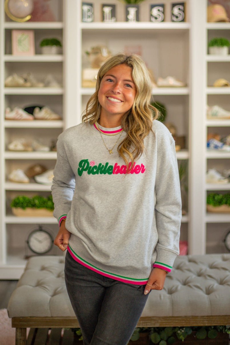 Stay cozy and show off your love for pickleball with our Pickleballer Sweatshirt. In cool gray, accented with pink and green trim and playful green and pink pickleball embroidery, this sweatshirt is perfect for any pickleballer. Stay warm in style on and off the court!