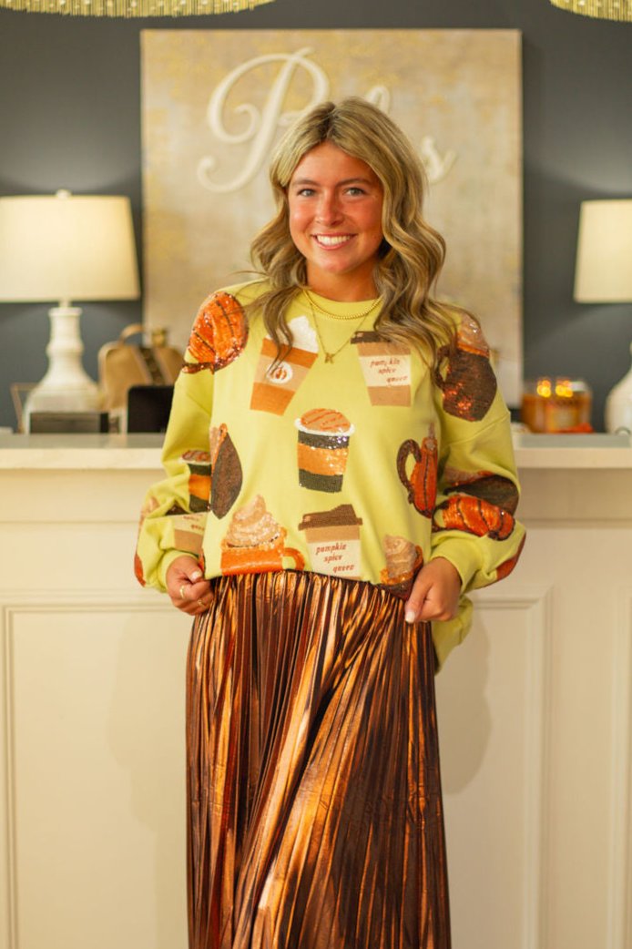 Add some spice to your wardrobe with our Pale Green Pumpkin Spice Queen Sweatshirt. This quirky and fun sweatshirt will have you feeling like royalty while keeping you warm and cozy. Perfect for autumn days or cozy nights in. (Only approved use of pumpkin spice all year round!)
