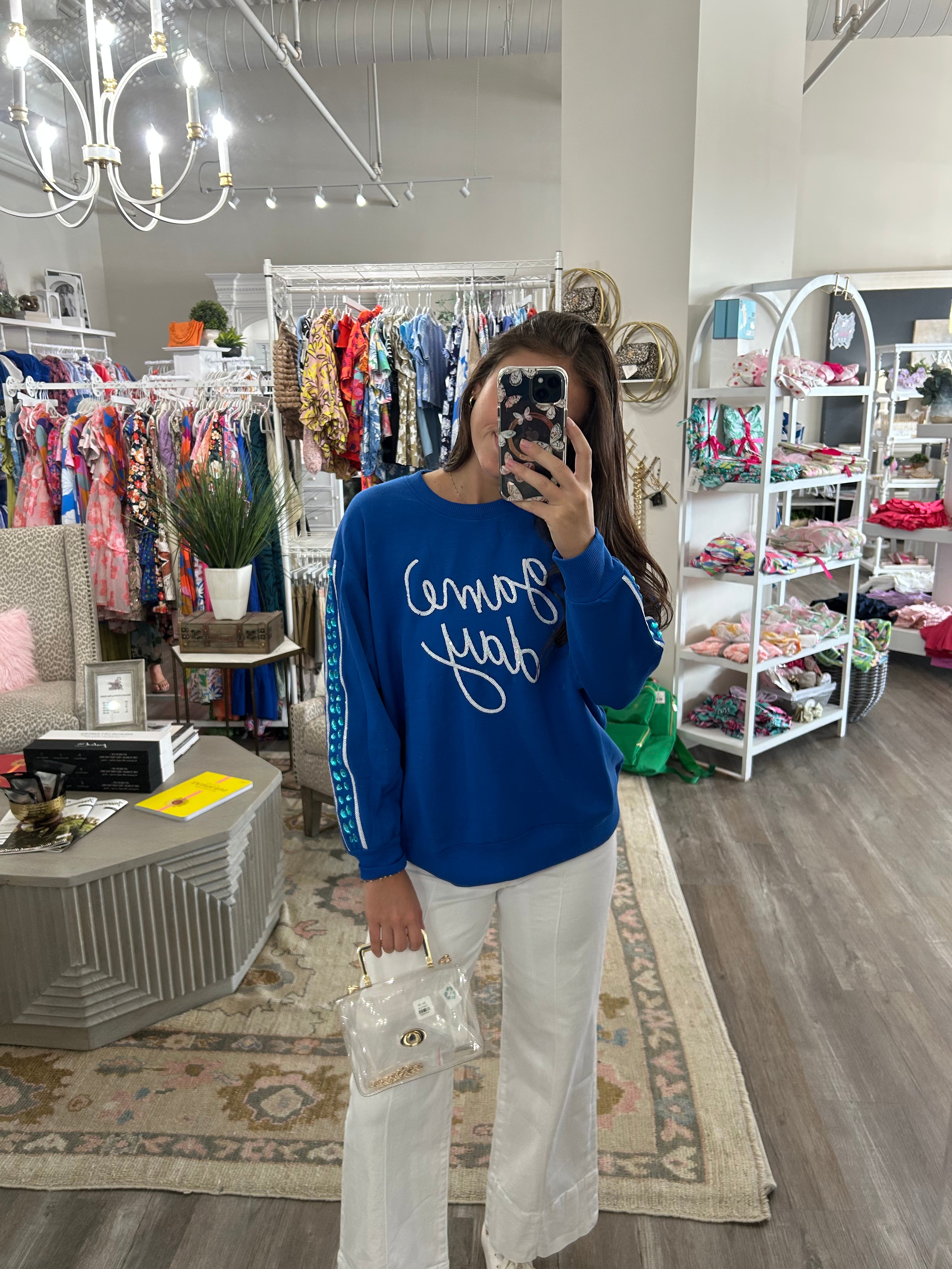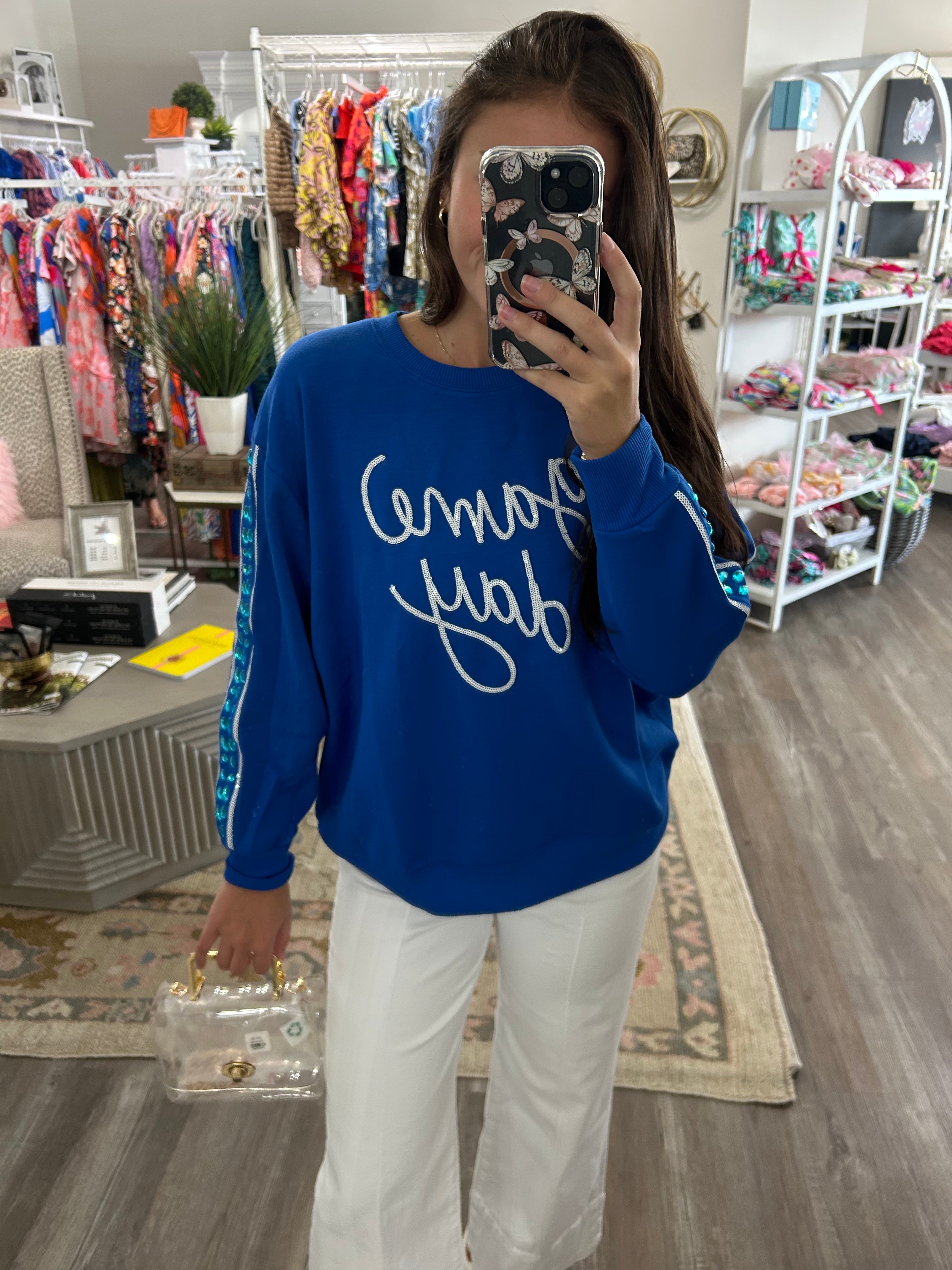 Elevate your game day style with this royal blue lightweight sweatshirt, featuring exquisite stitching details on the front and sleeves. Accented with subtle blue rhinestones, it offers a refined sparkle that captures attention effortlessly. Designed for comfort and sophistication, this sweatshirt ensures you stand out with elegance while cheering on your team.