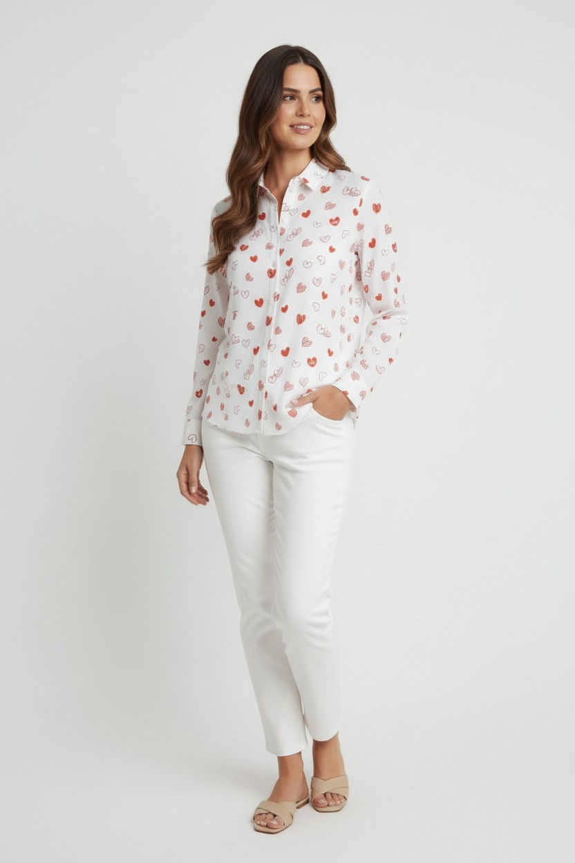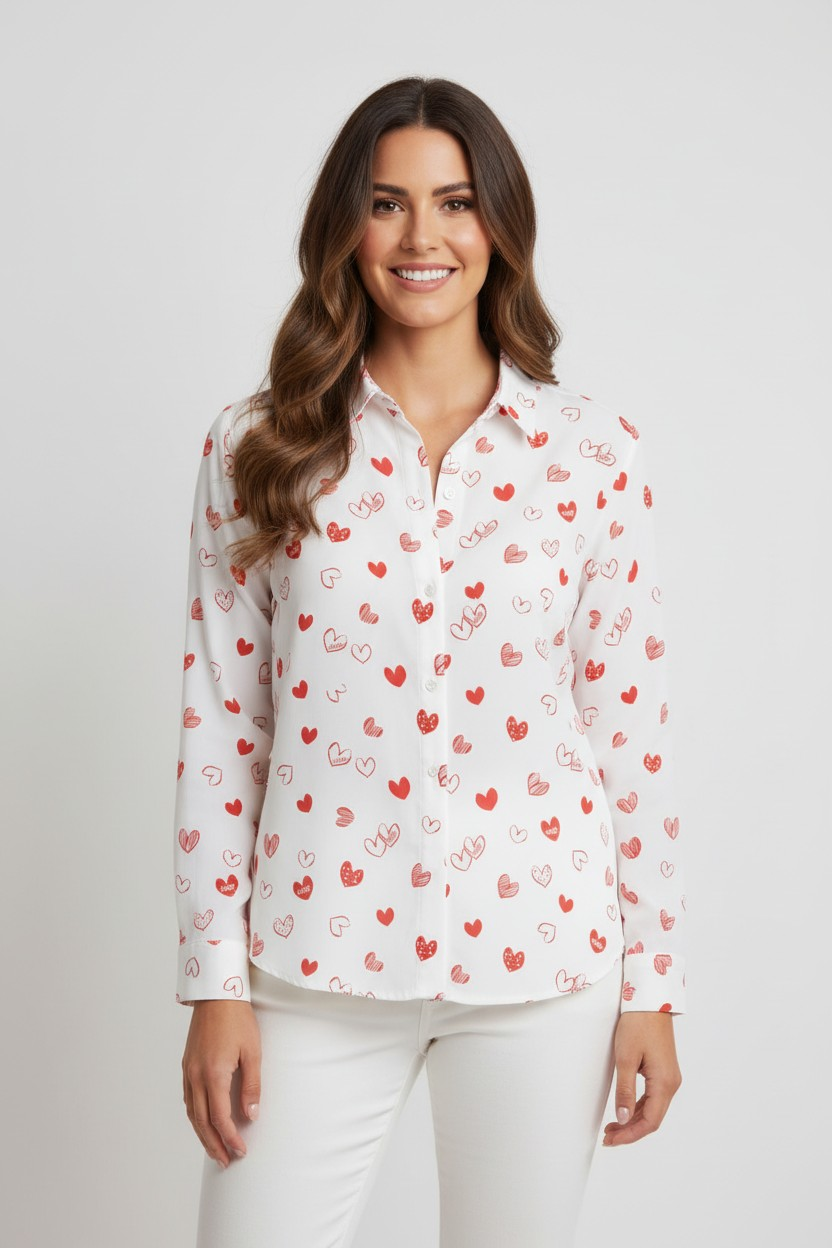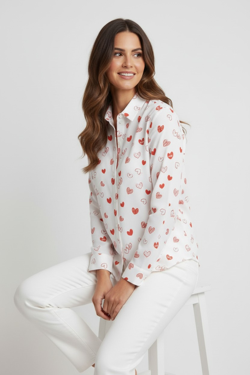 This charming button-up blouse features a playful heart print in red and pink, making it a perfect addition to your casual wardrobe. The soft, breathable fabric offers comfort for all-day wear, while the button-down design and collared neckline add a classic touch. Ideal for a relaxed yet stylish look, this blouse pairs well with jeans, skirts, or shorts for an easygoing, chic outfit.