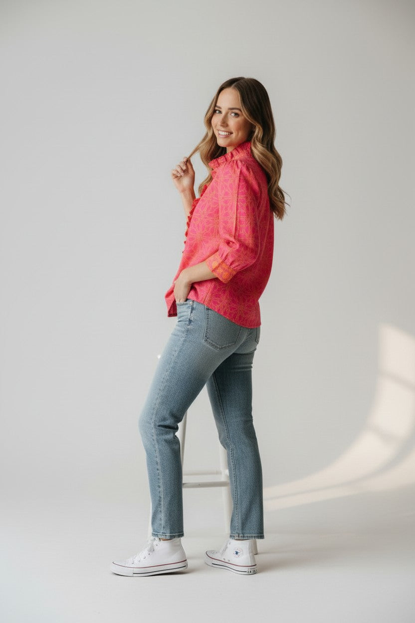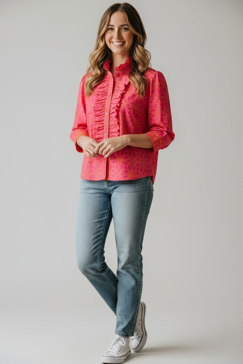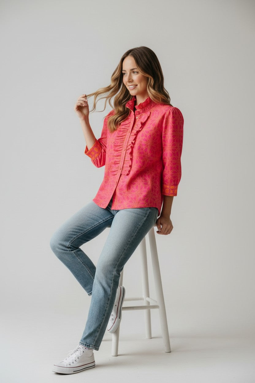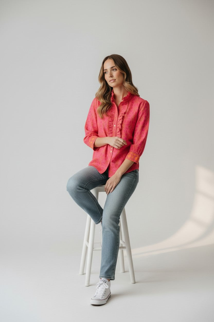 Designed with statement ruffle detailing and a softly structured fit, this top brings personality to polished everyday looks. The lightweight woven fabric drapes comfortably while maintaining a refined shape through the bodice and sleeves. Its tailored finish makes it easy to dress up for work or style down for casual plans. A standout piece that adds movement and character to your wardrobe rotation.