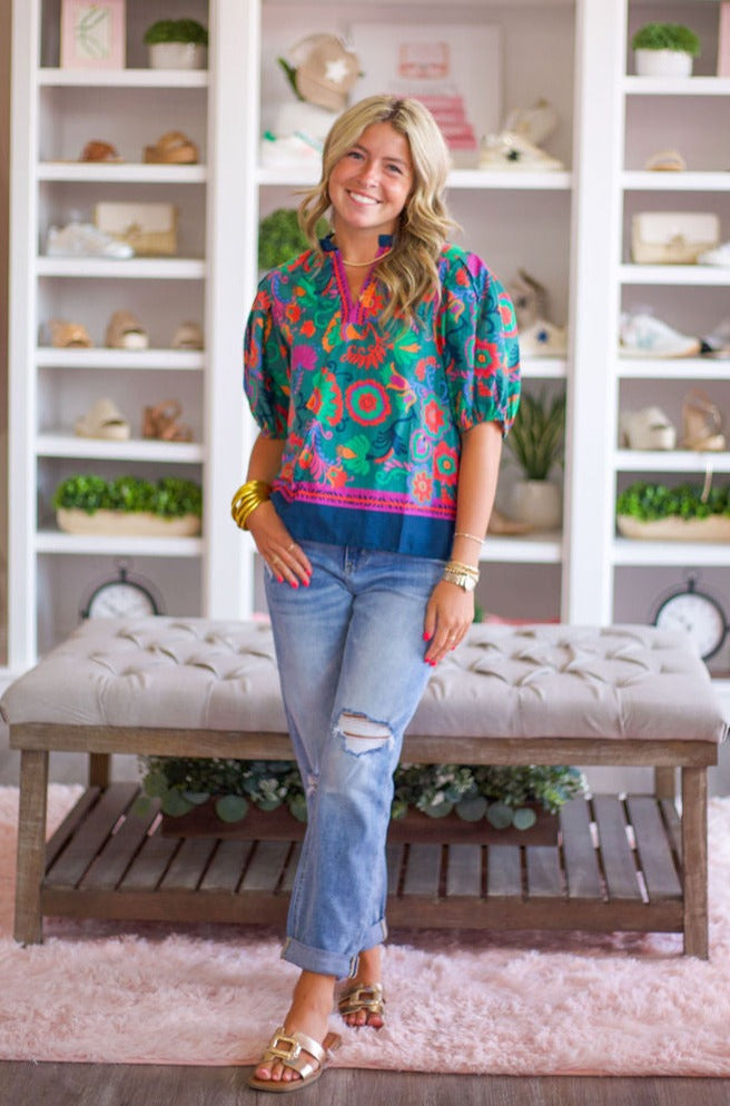 Hunter Green Floral Puff Sleeve Top