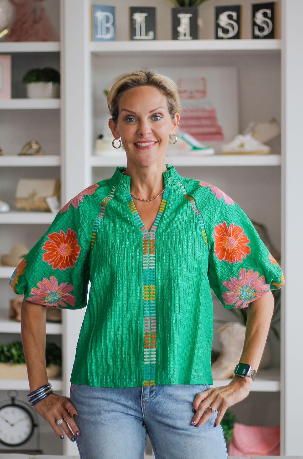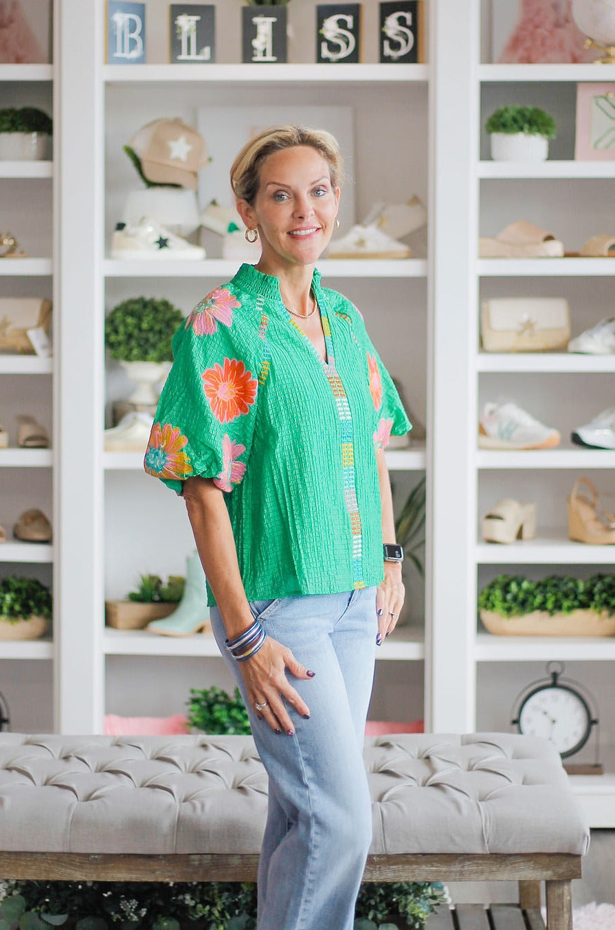 Flowered Green Puff Sleeve Top