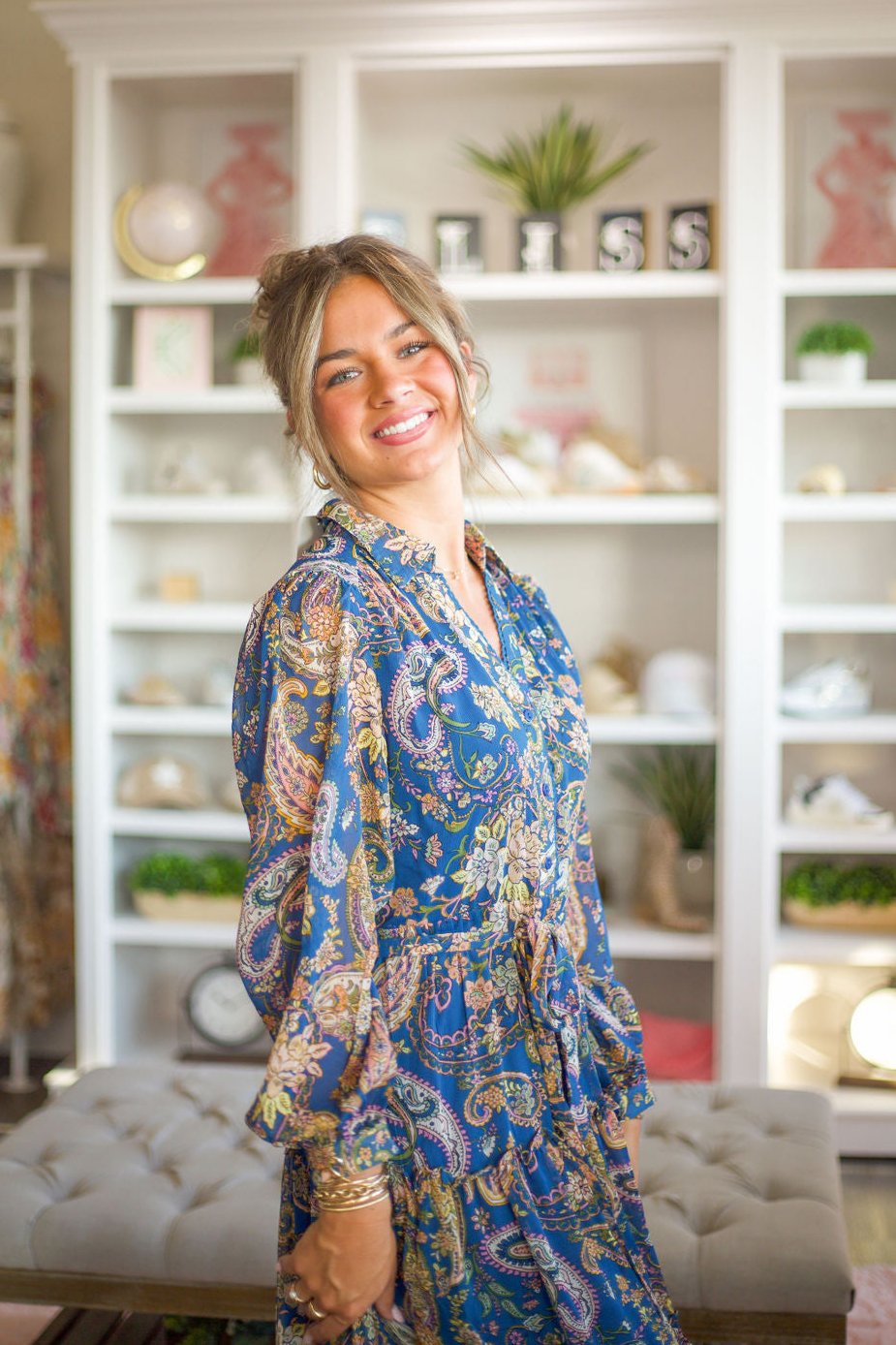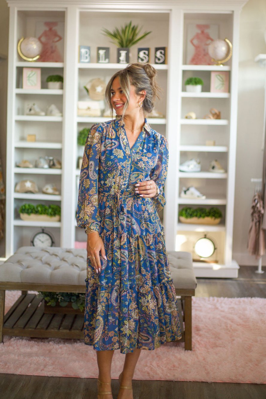 Exclusive Print Collar Dress in Denim Blue with Pailsey