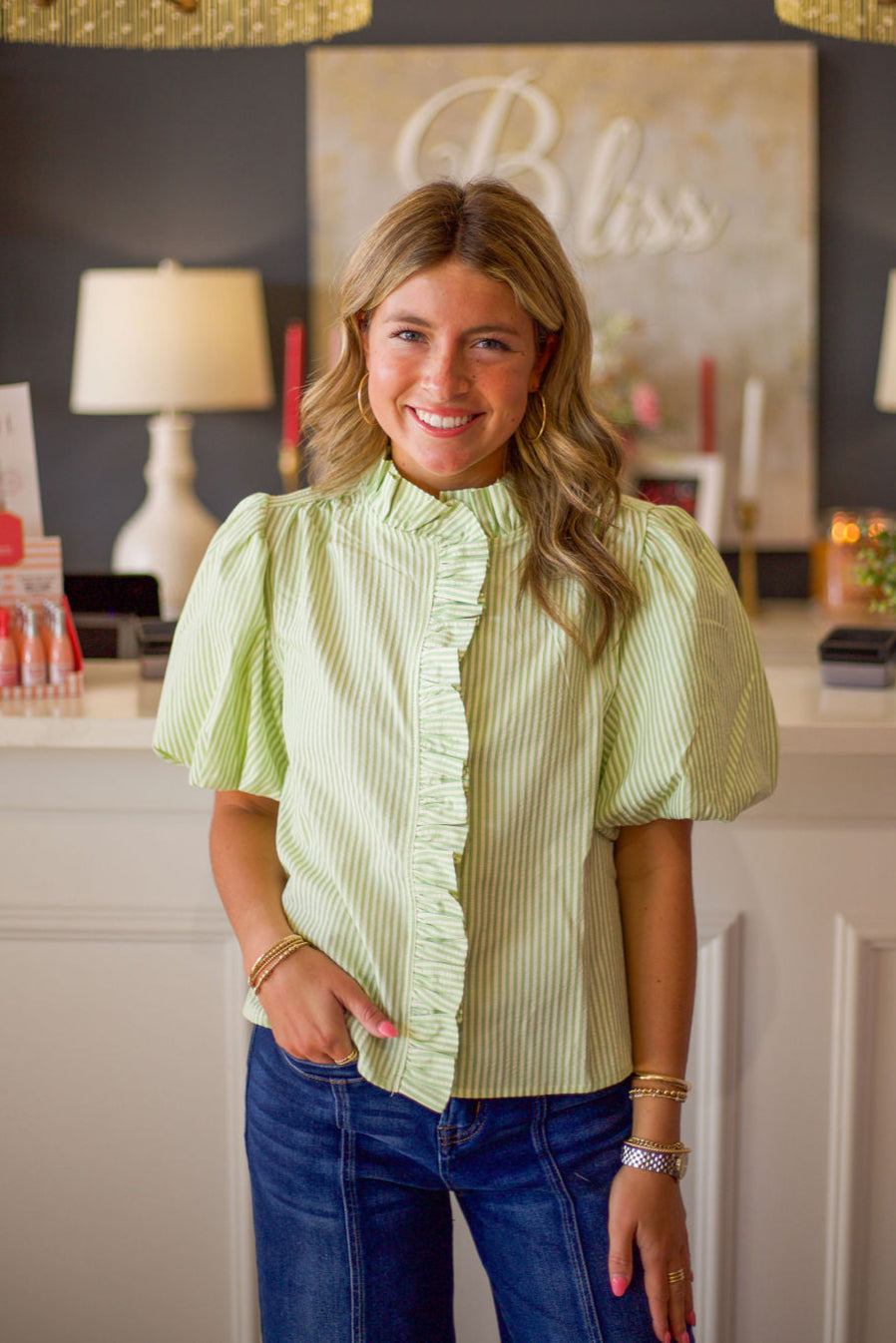 Lime Green Button Down Bubble Sleeves Top