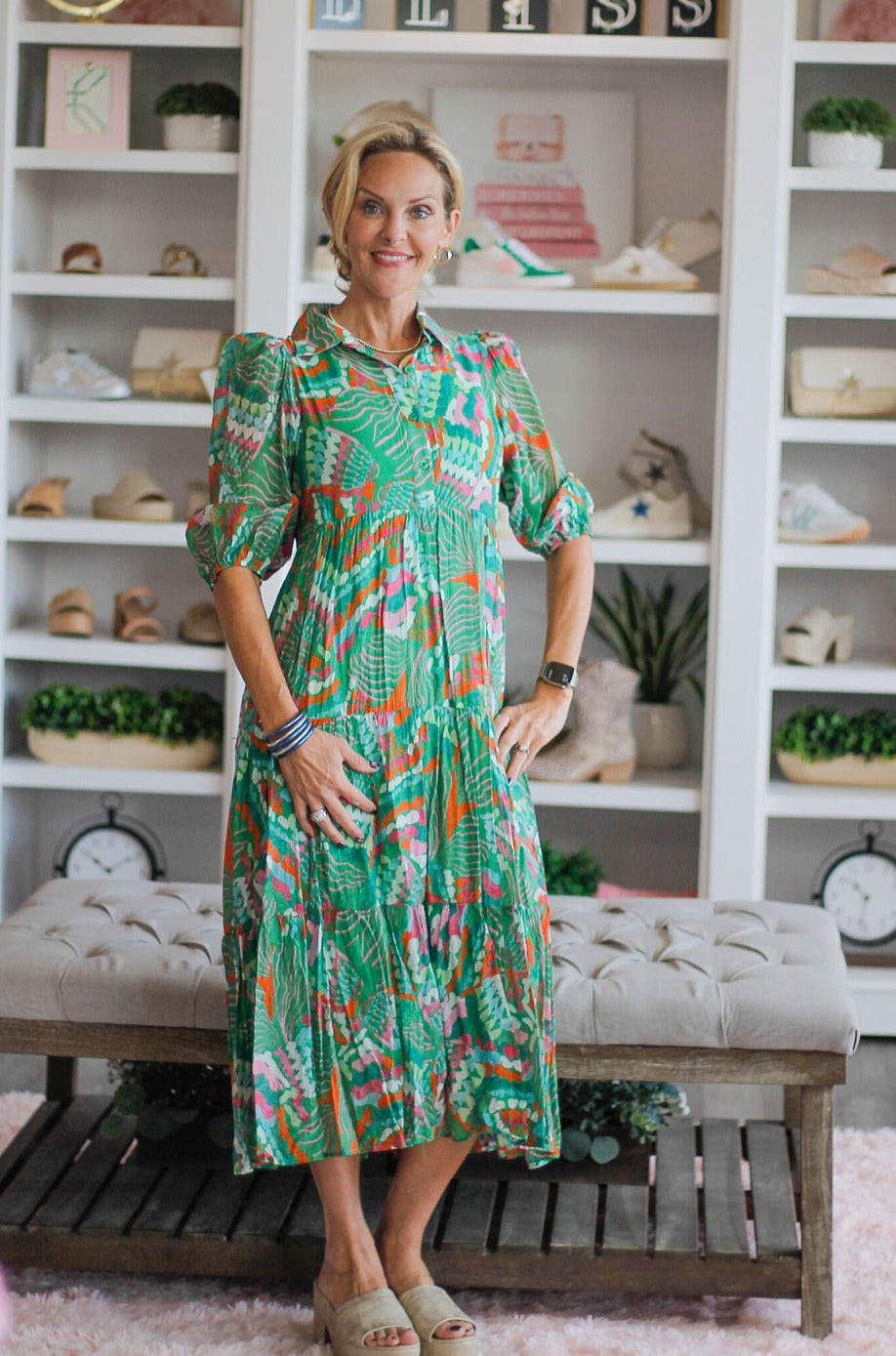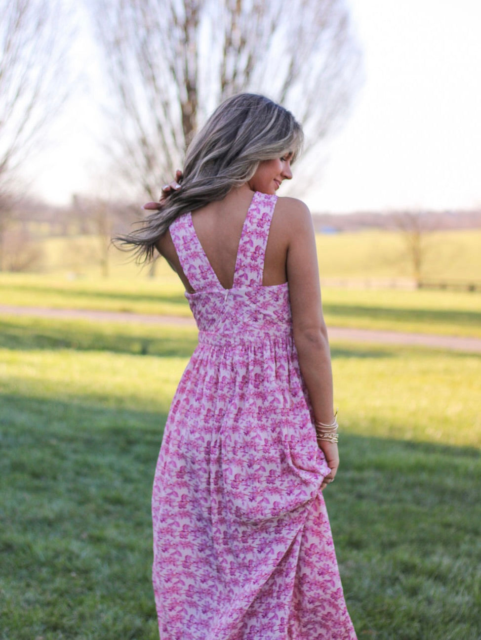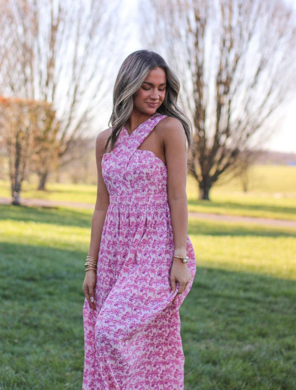 Floral printed, spaghetti strap dress with tiered bubble hem and a smocked back detail.