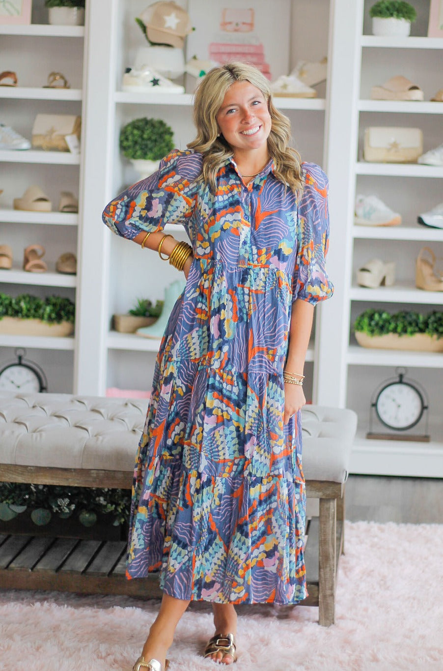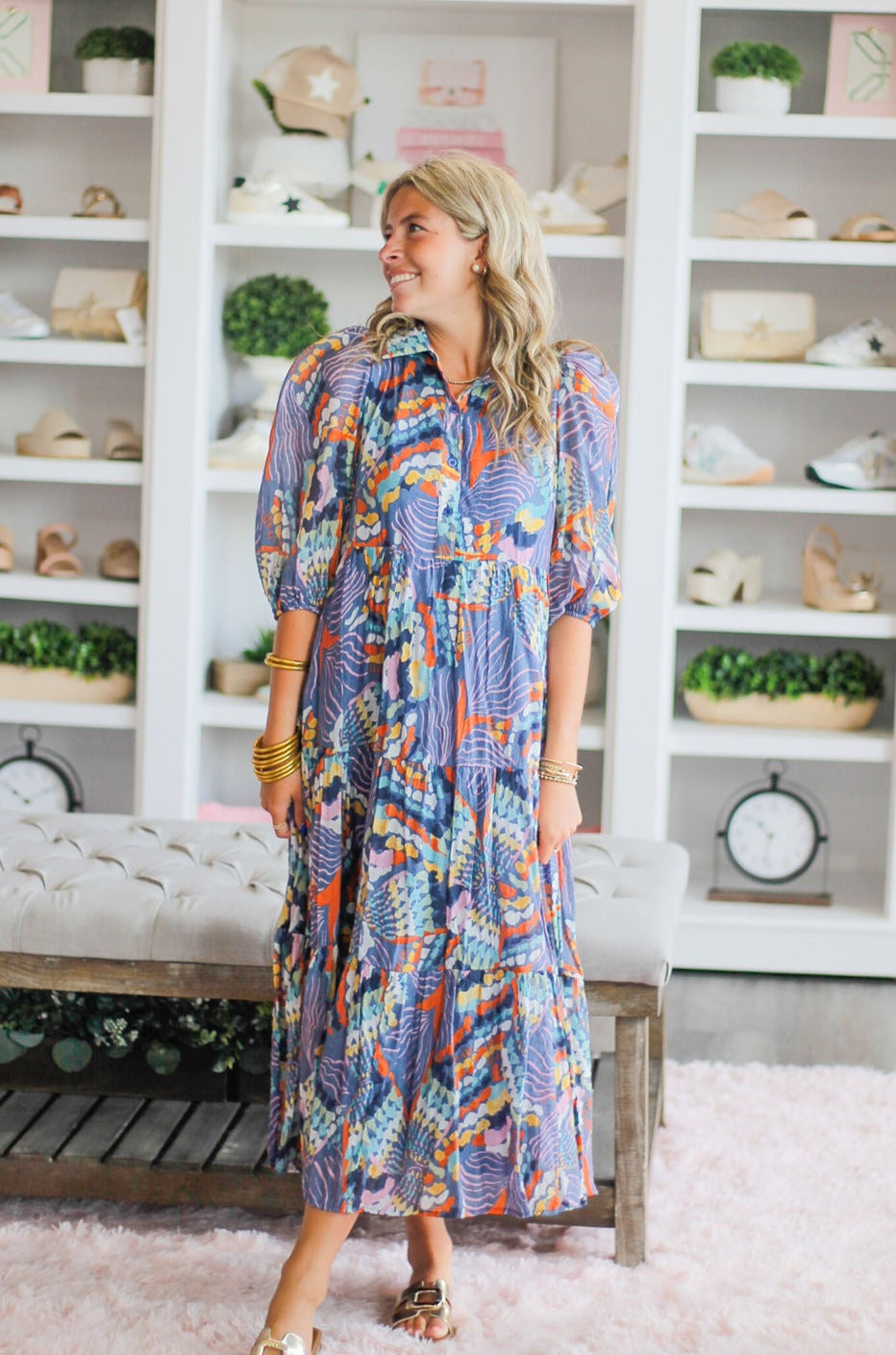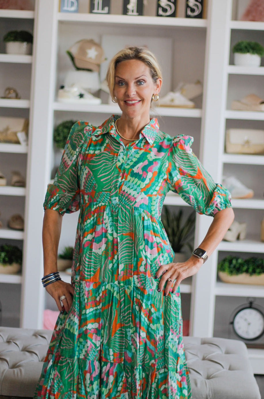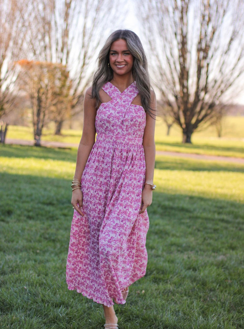 Floral printed, spaghetti strap dress with tiered bubble hem and a smocked back detail.