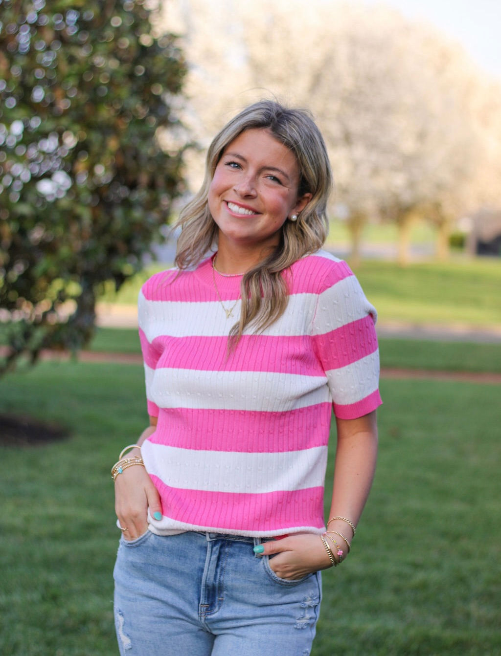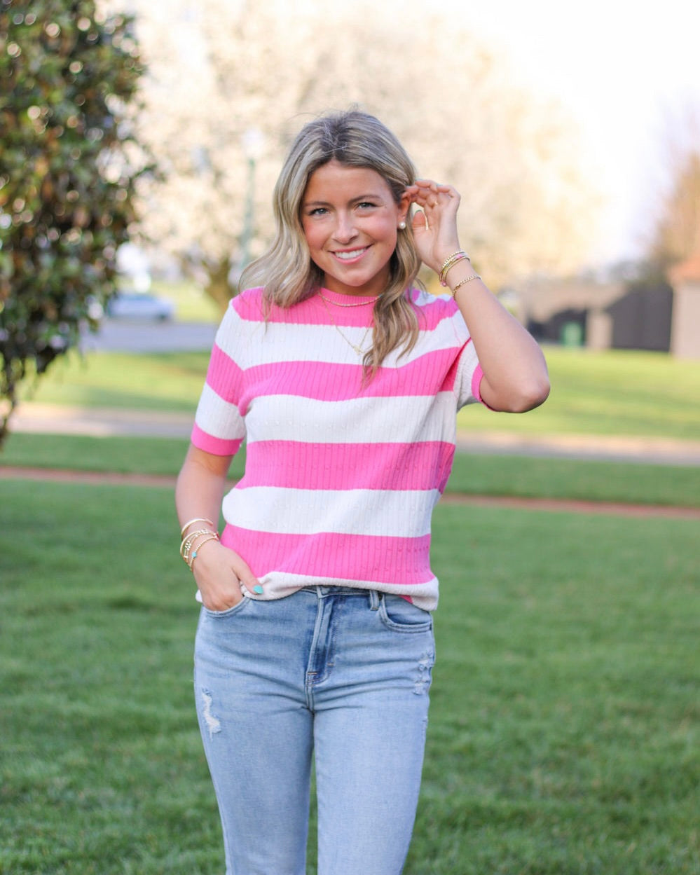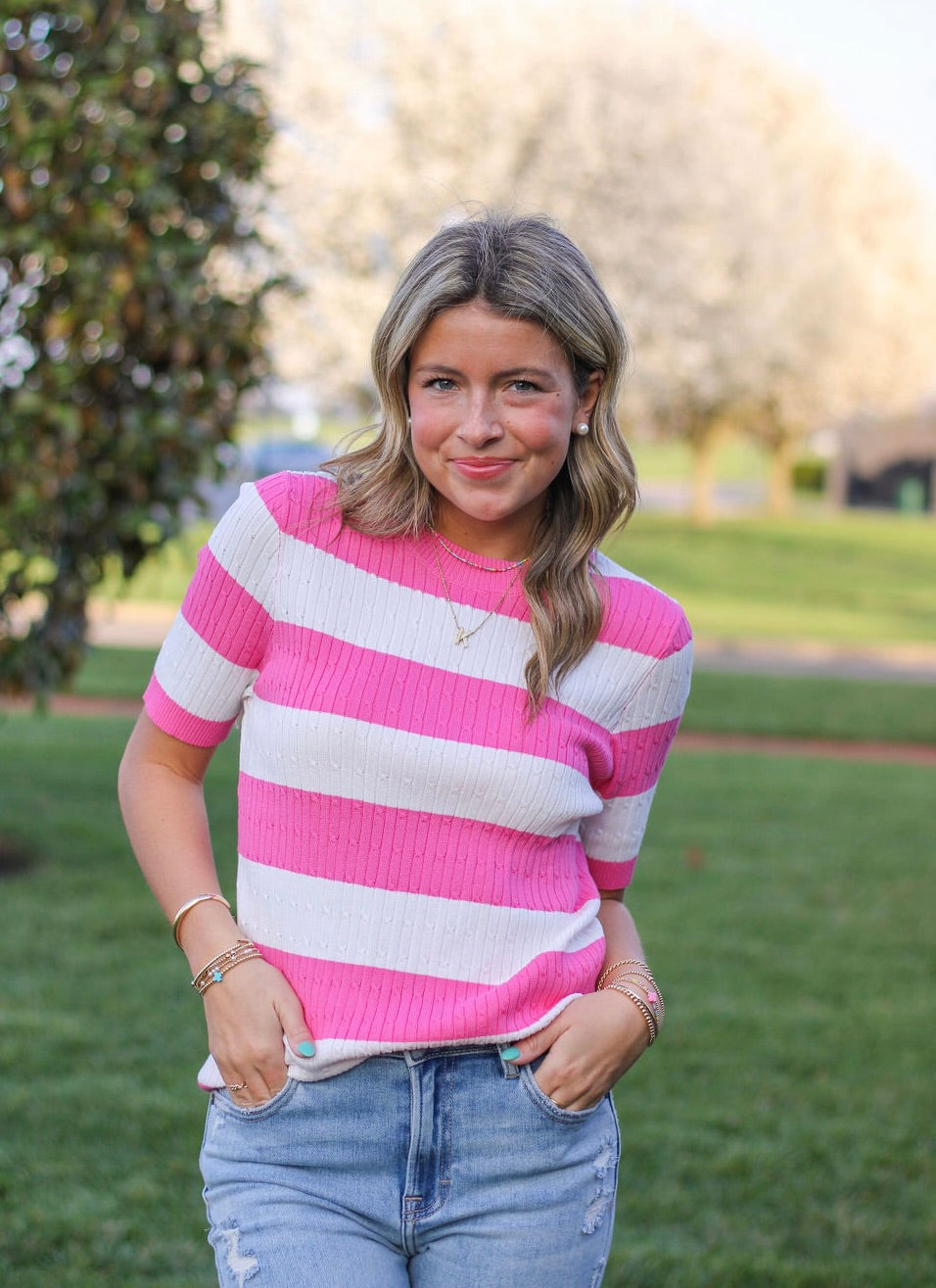 Pink and White Stripped Crew Neck Knit Short Sleeve