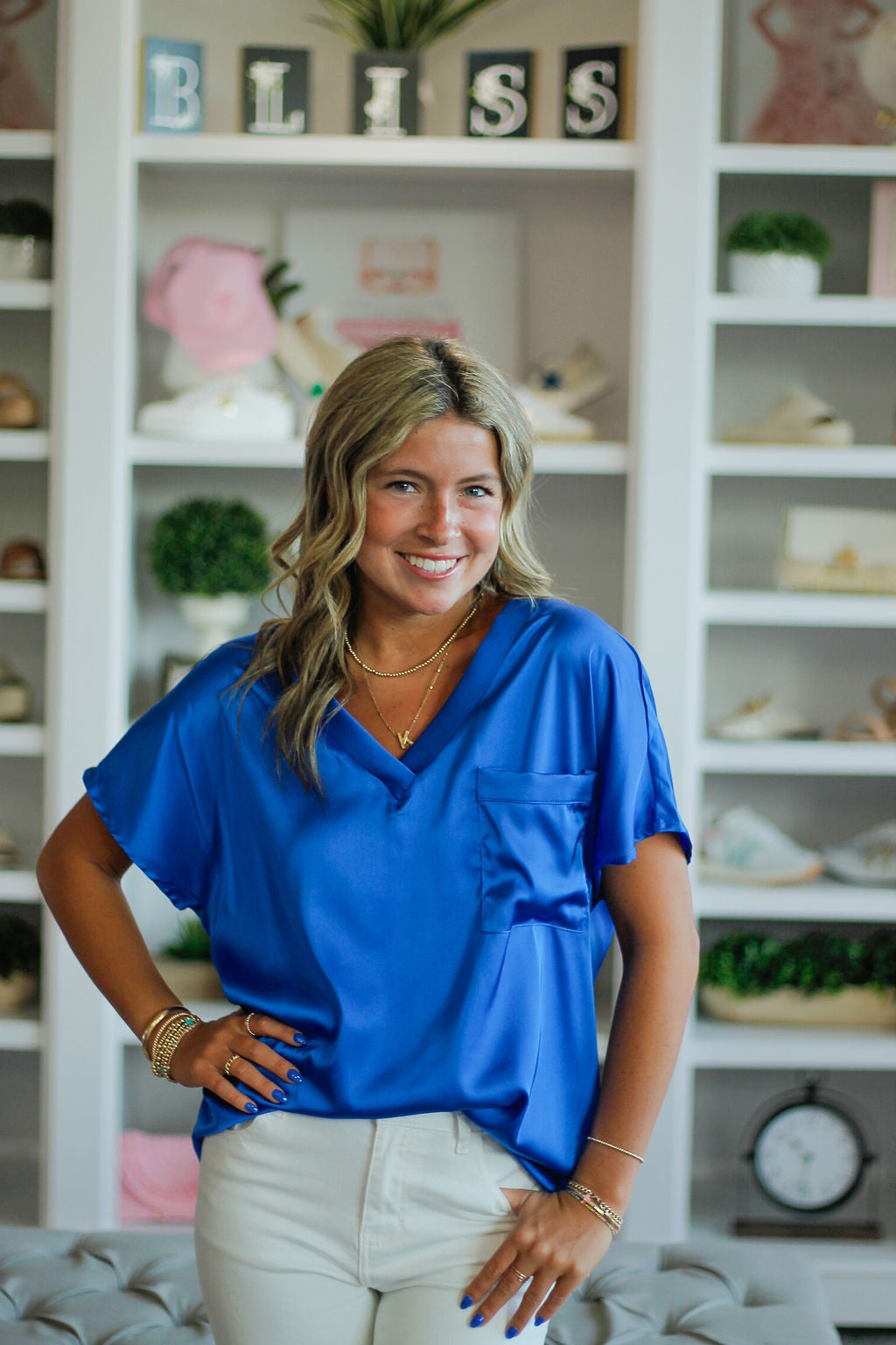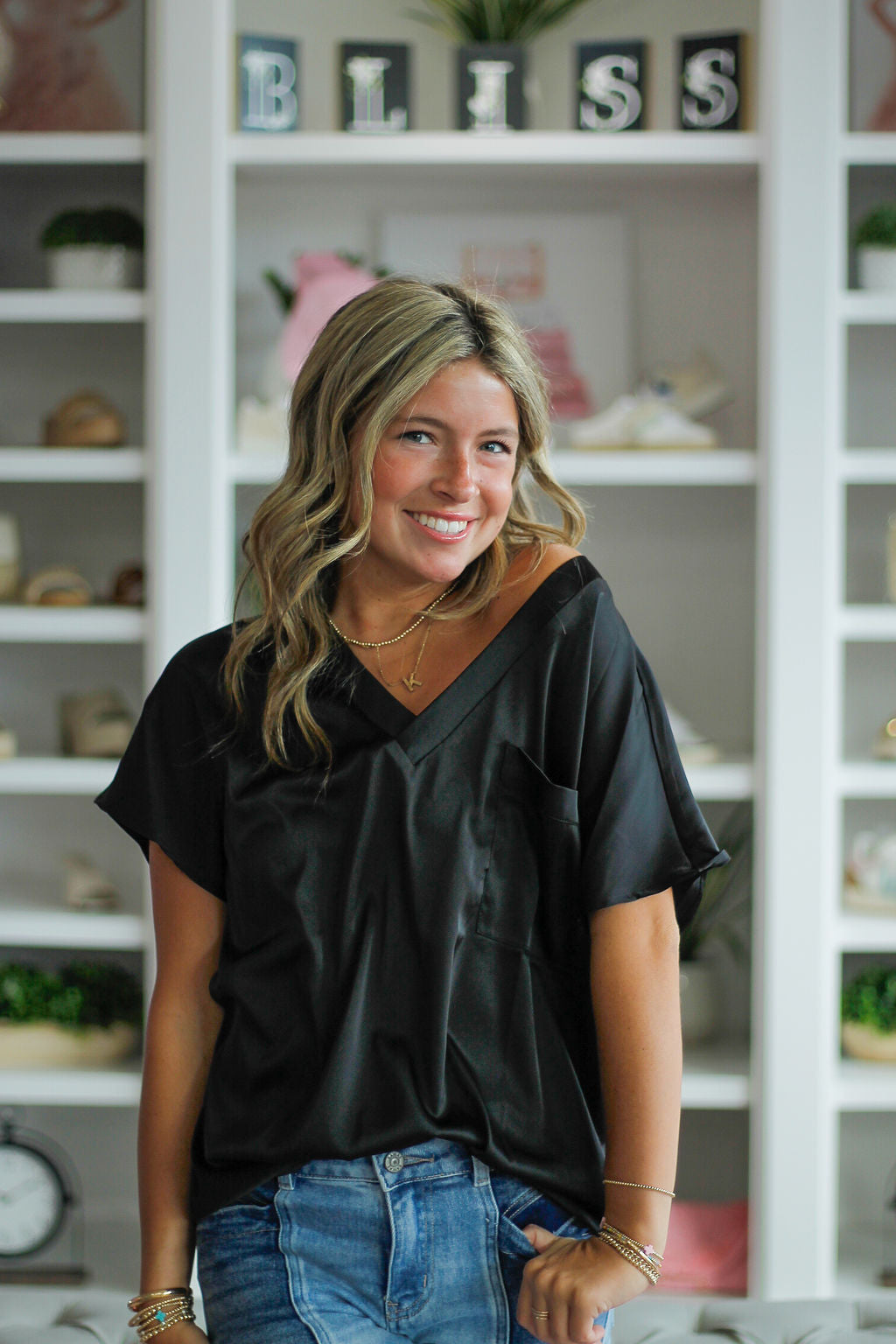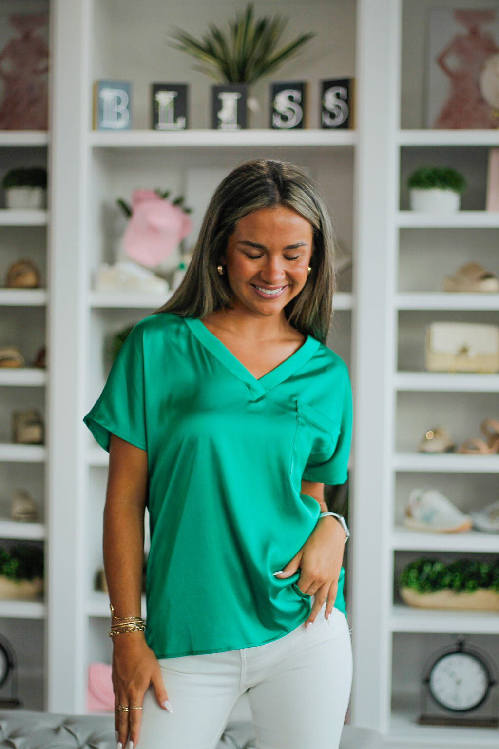 V-Neck Chest Pocket Detail Satin Blouse Top