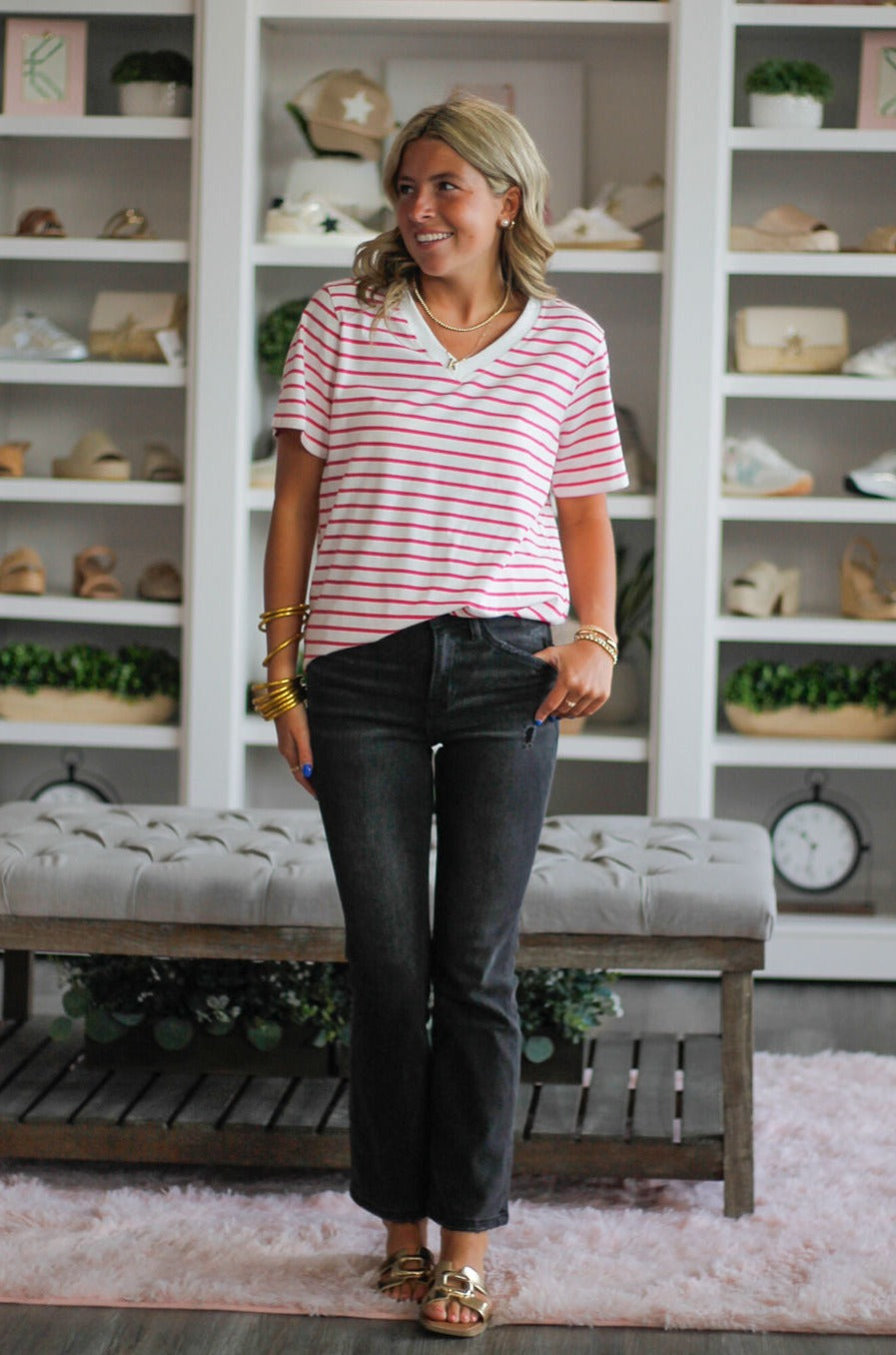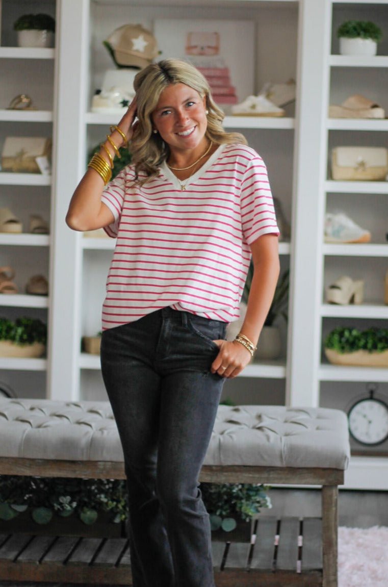 V-Neck Short Sleeve Strip Printed Cotton Knit Top