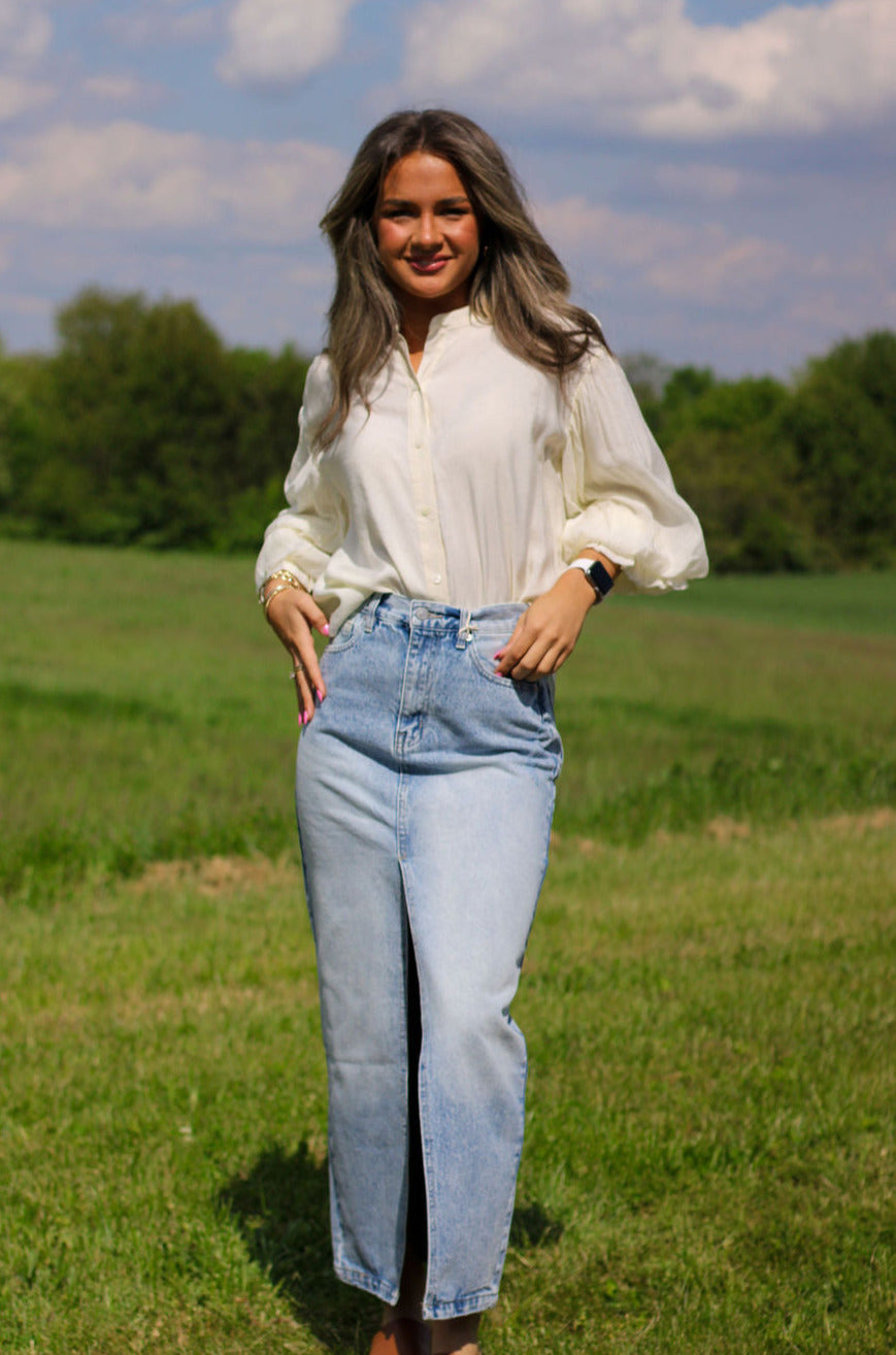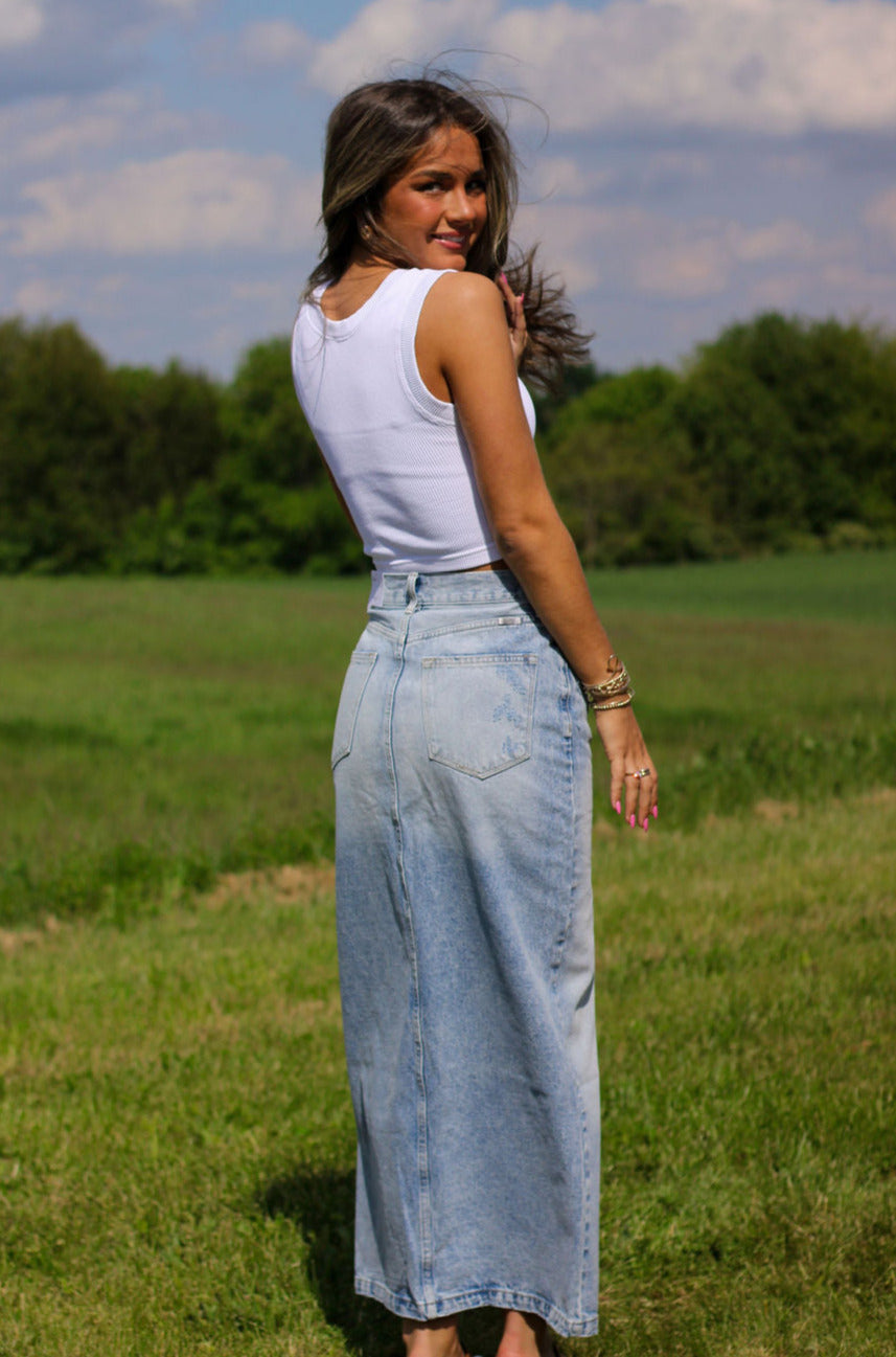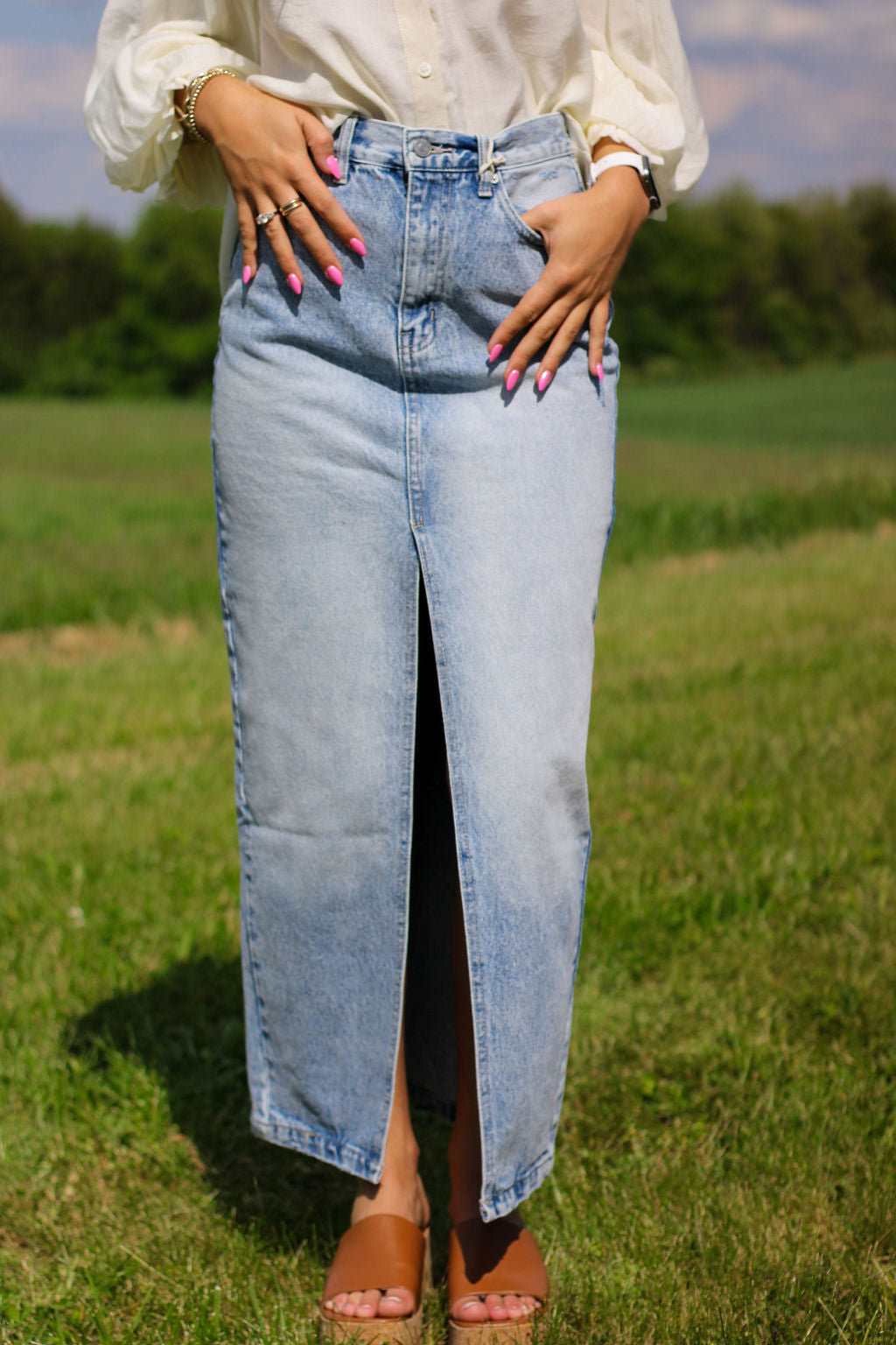 The Ready For Rodeo Skirt is a 90's inspired maxi skirt in a light stone wash. Made with a rigid material and featuring a 5 pocket design, this skirt also has an open slit cut detail in the front middle and a regular hem. Perfect for country concerts, it adds a stylish touch to your outfit.