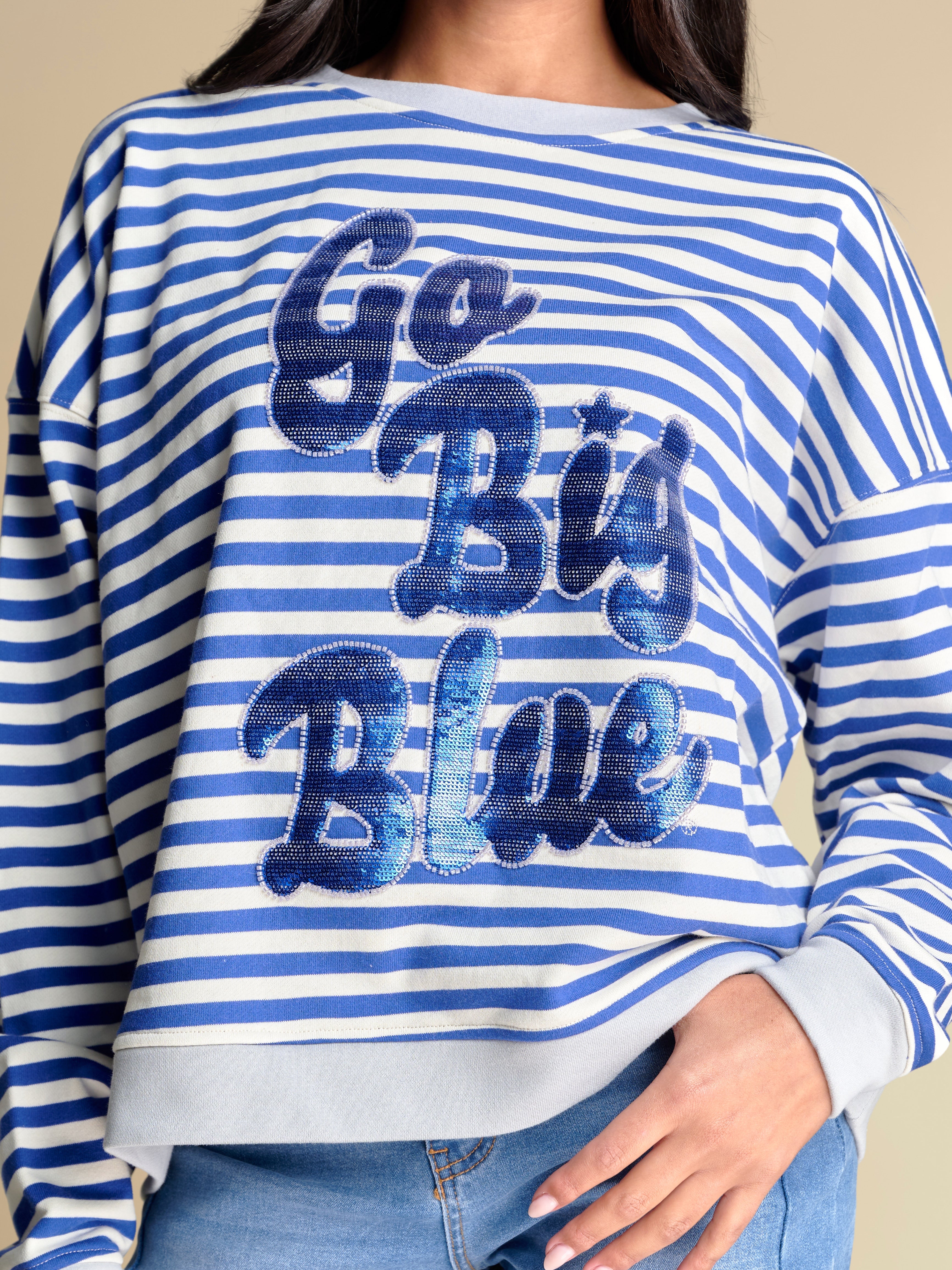 Show your team spirit in a subtle yet stylish way with The Kentucky Stripe Pullover, a comfortable light blue long-sleeve top featuring classic horizontal stripes. This relaxed fit pullover proudly displays "Go Big Blue" in a bold script across the chest, complemented by grey ribbed detailing at the collar, cuffs, and hem, making it an ideal choice for cozy comfort and unwavering fan allegiance.
