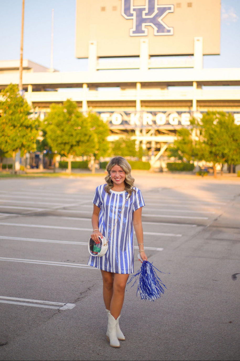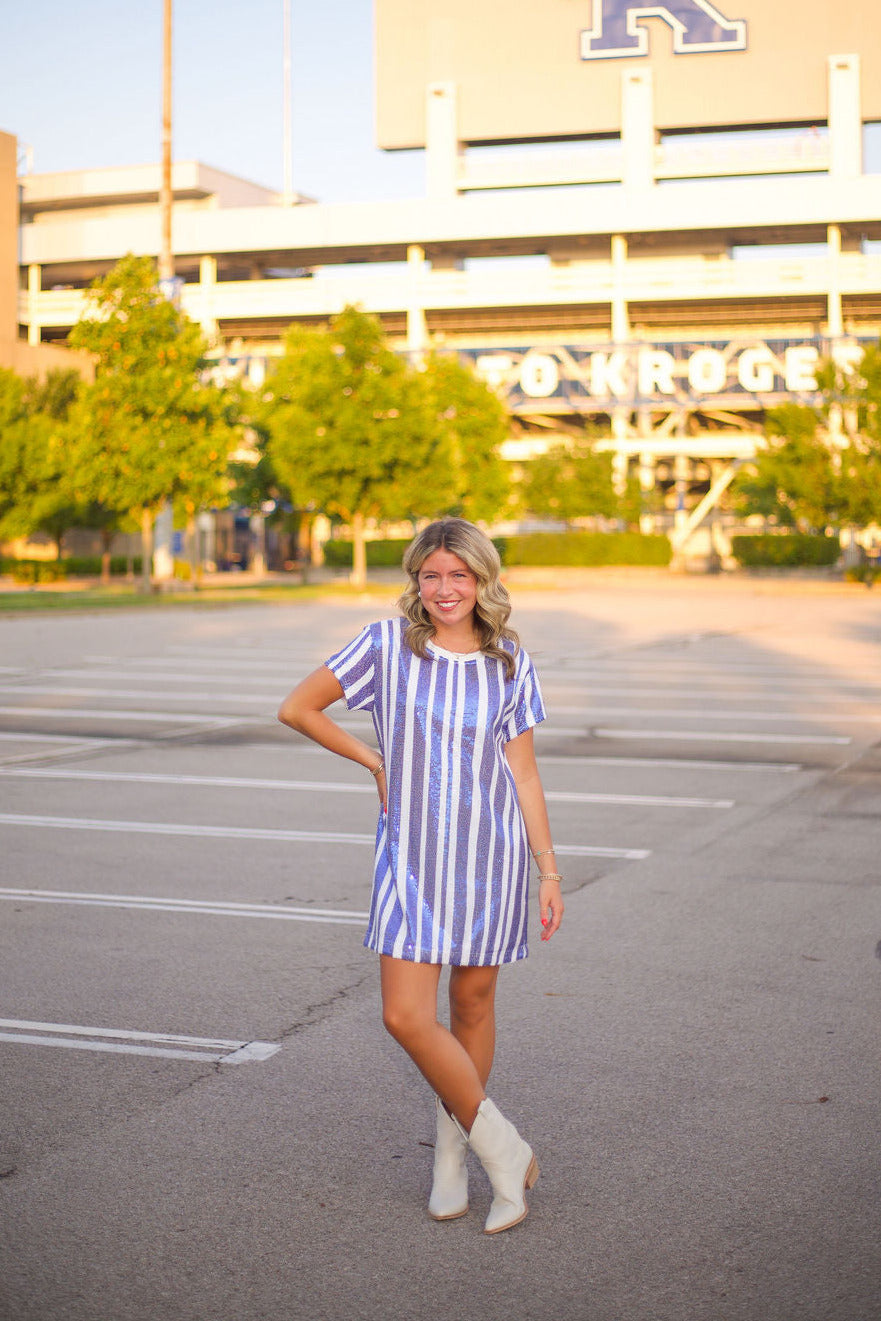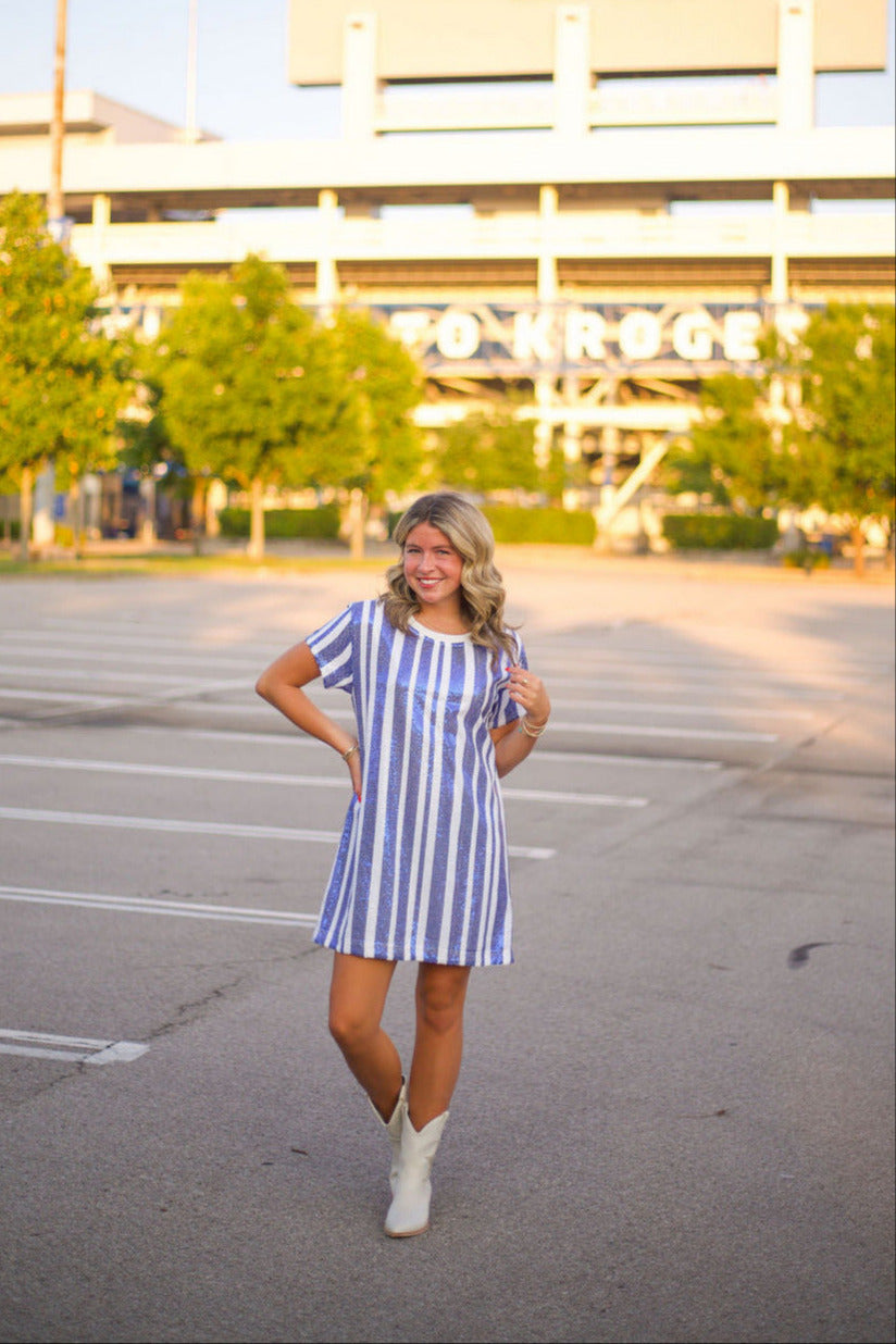 Dress Julia: Ready to cheer on game day! This dress is perfect for showing your team spirit in Blue and White!
