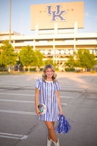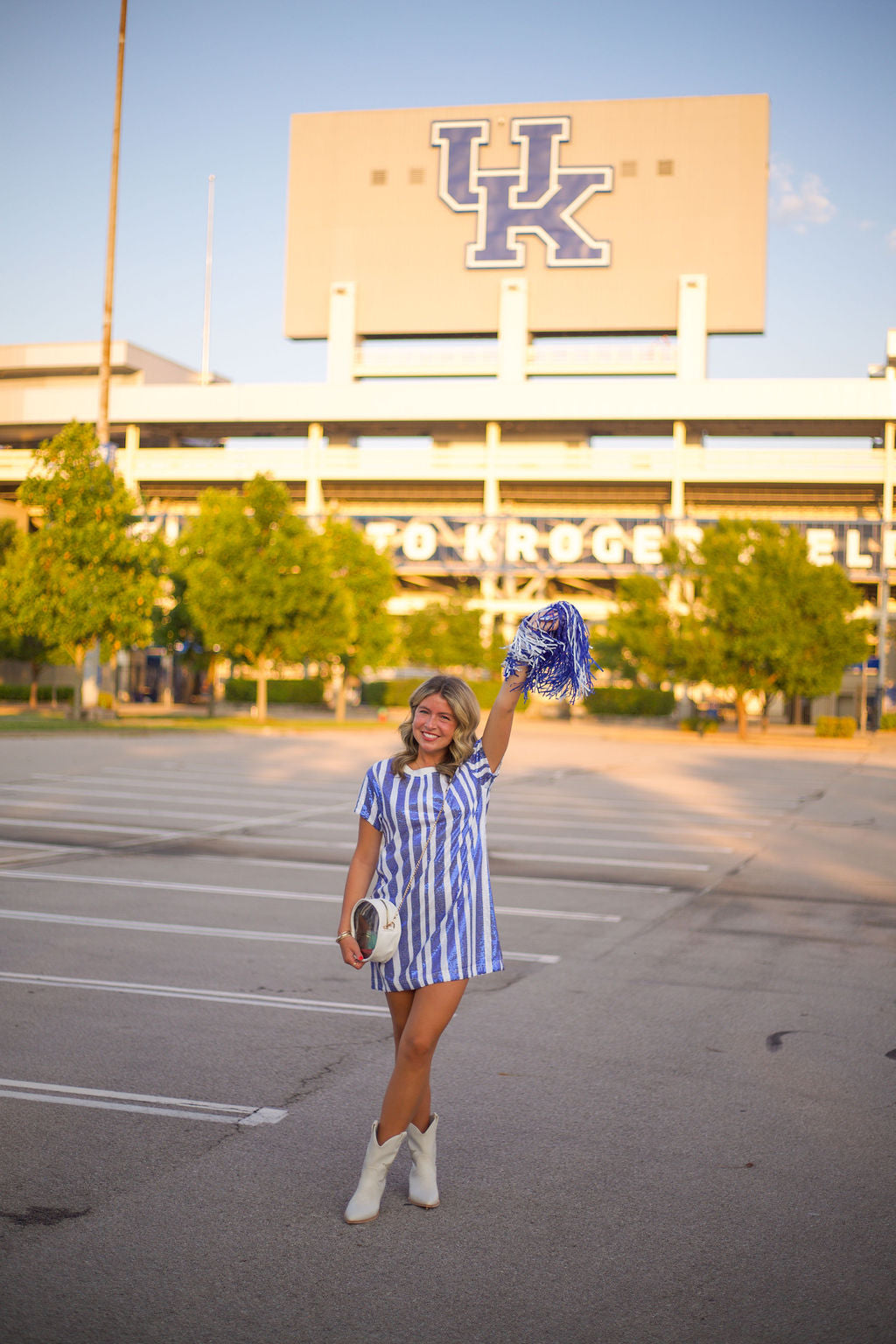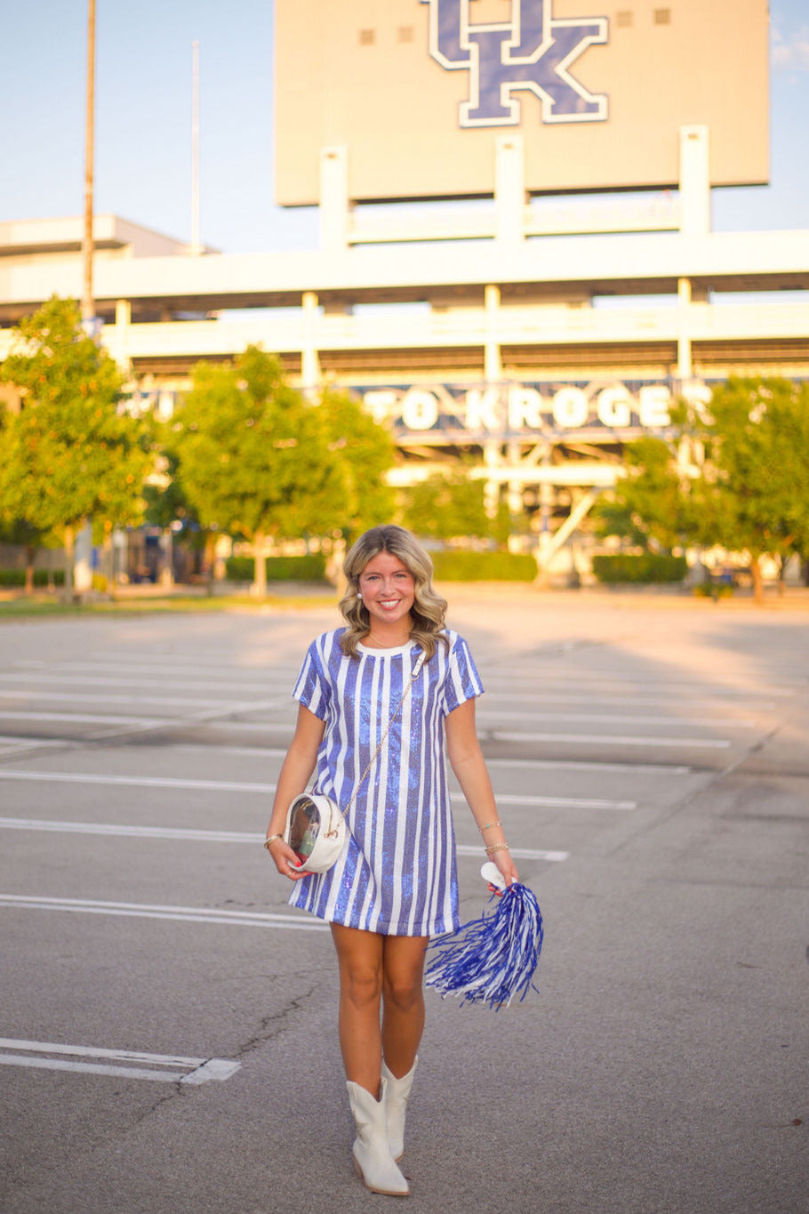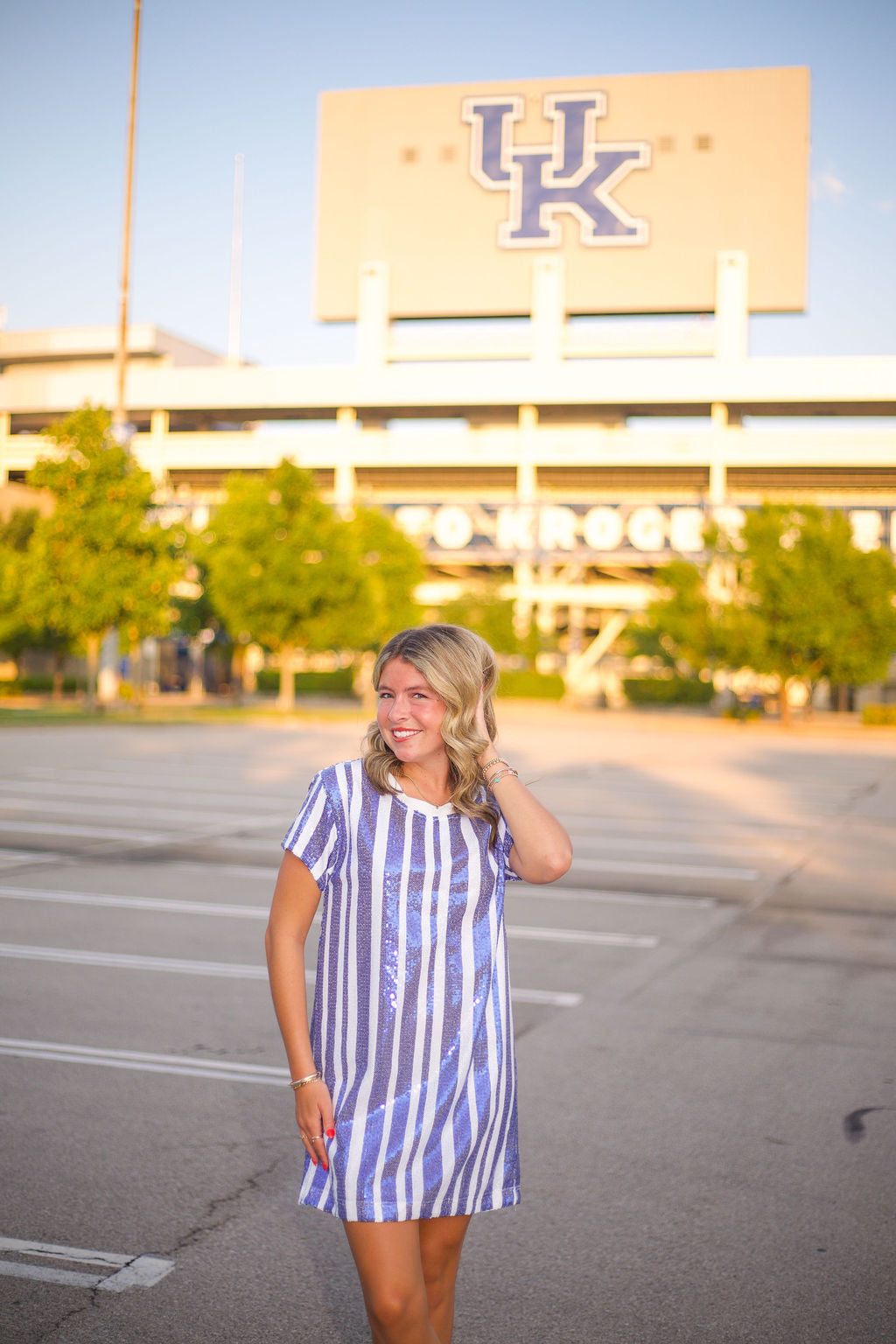 Dress Julia: Ready to cheer on game day! This dress is perfect for showing your team spirit in Blue and White!