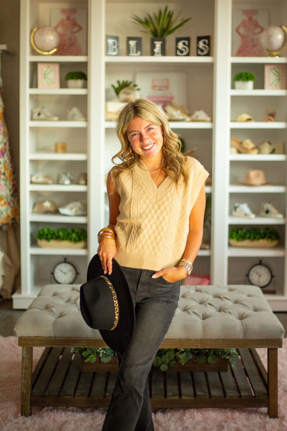 Stay cozy and cute with our Cable Knit Sweater Vest in camel. This adorable vest is perfect for layering with a blouse for cooler weather. Its versatility makes it a must-have for any wardrobe. Don't miss out on this adorable and practical addition to your fall and winter outfits!