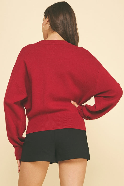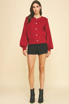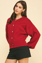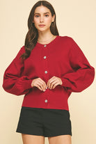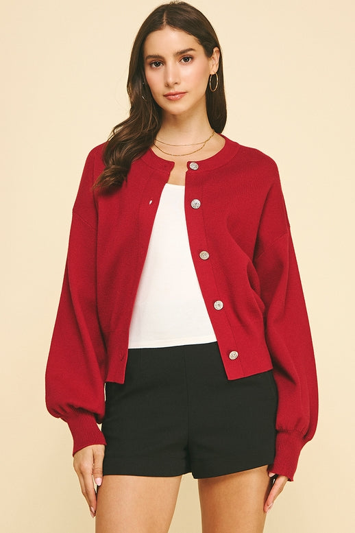 A refined knit layer with a touch of elegance, this cardigan features jewel-like buttons that add subtle shine to its classic silhouette. The round neckline keeps the look polished, while the balloon sleeves bring a soft, voluminous shape. Designed for both comfort and style, it transitions effortlessly from casual wear to a chic layering piece. Perfect for adding a sophisticated finish to any outfit.