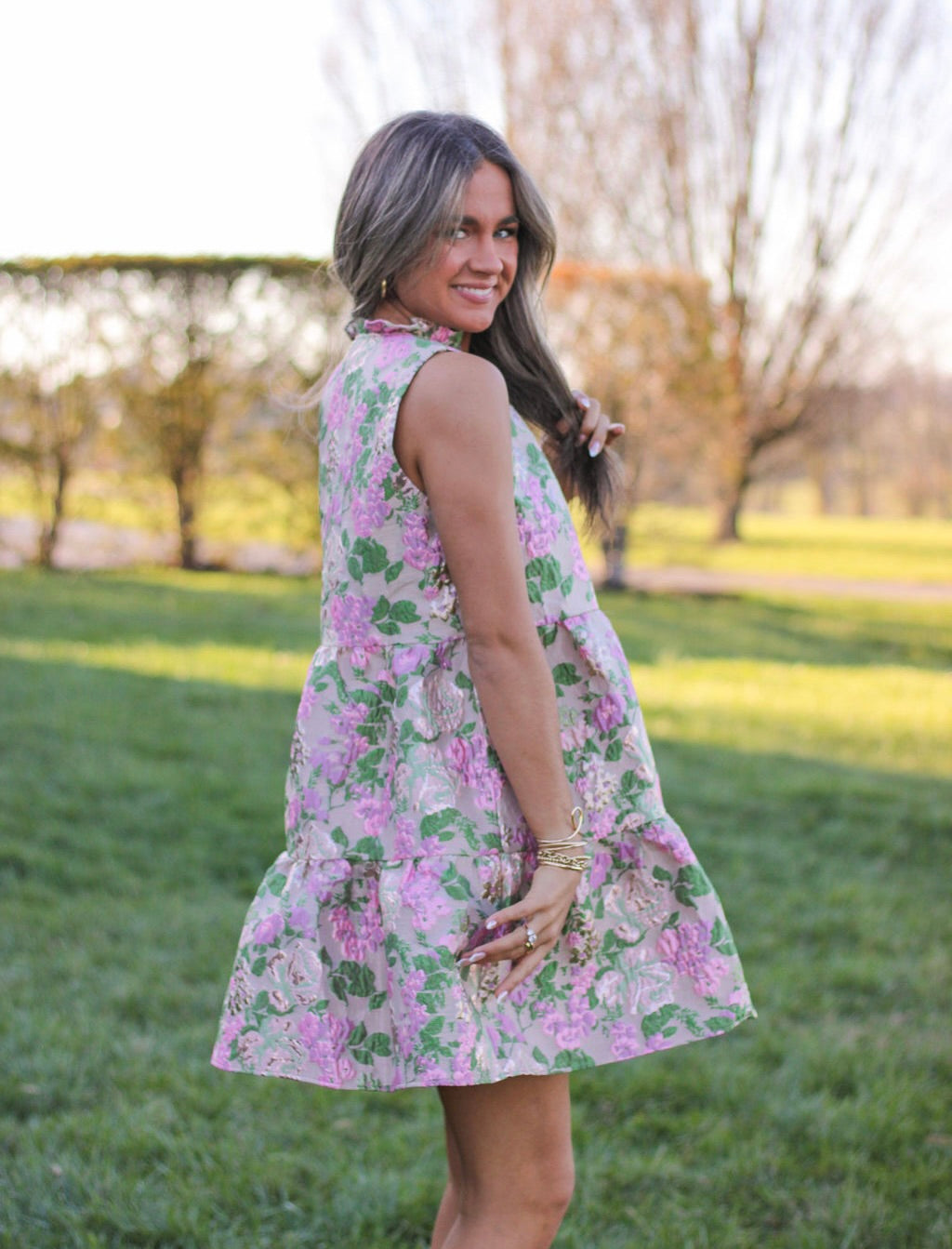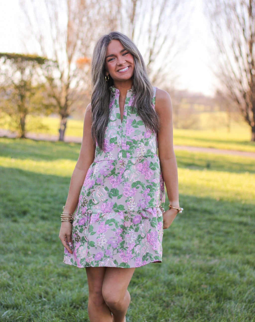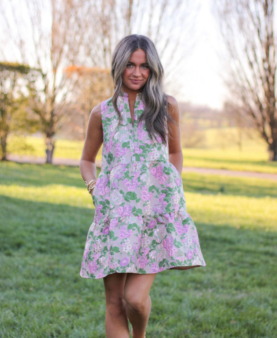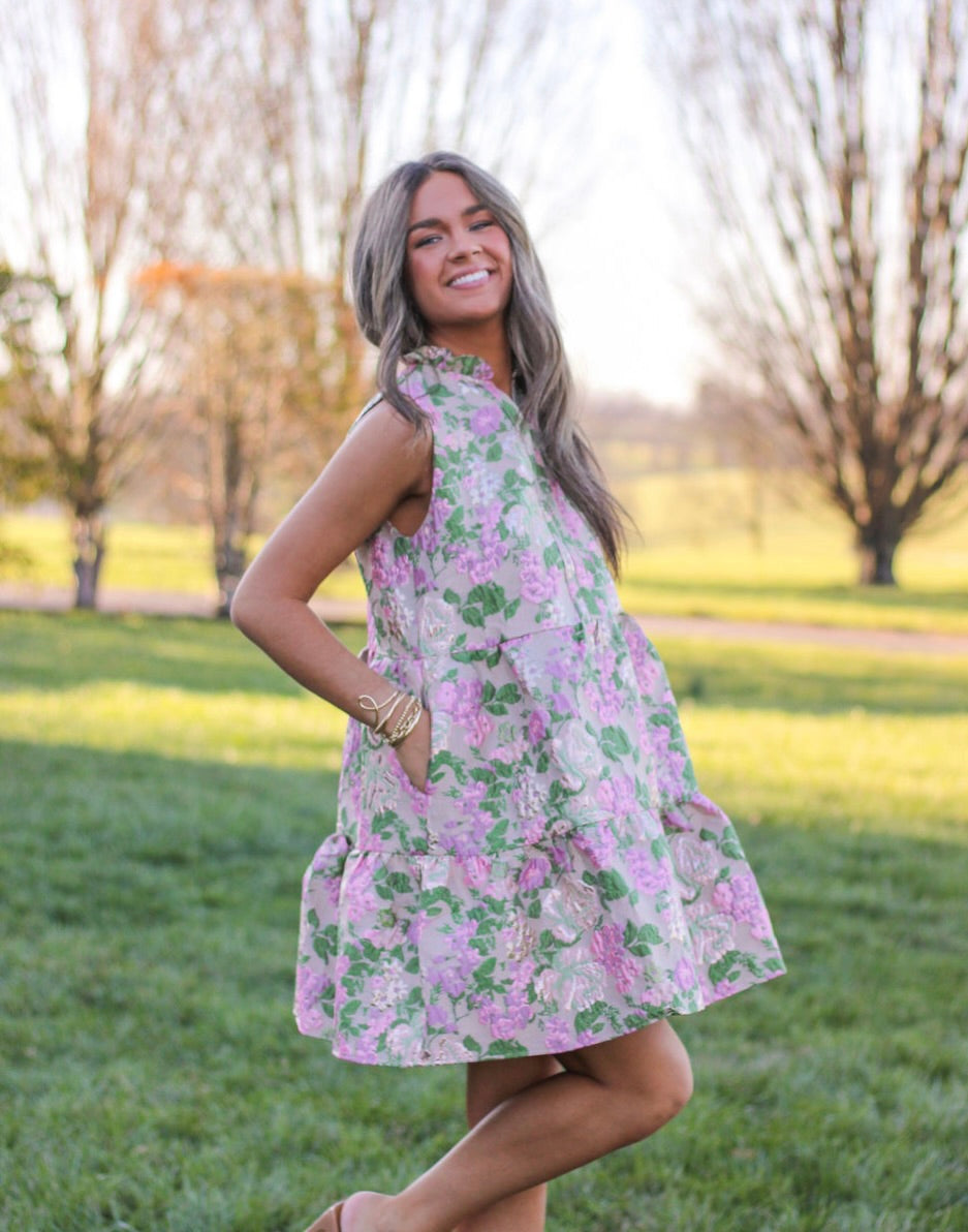 Introducing the Amanda Textured Dress. Made with a sleeveless design and elegant flower texture in light pink and green, this dress is perfect for that special occasion. The v-neck adds a touch of sophistication, while the pockets provide both style and convenience. A must-have for any wardrobe.