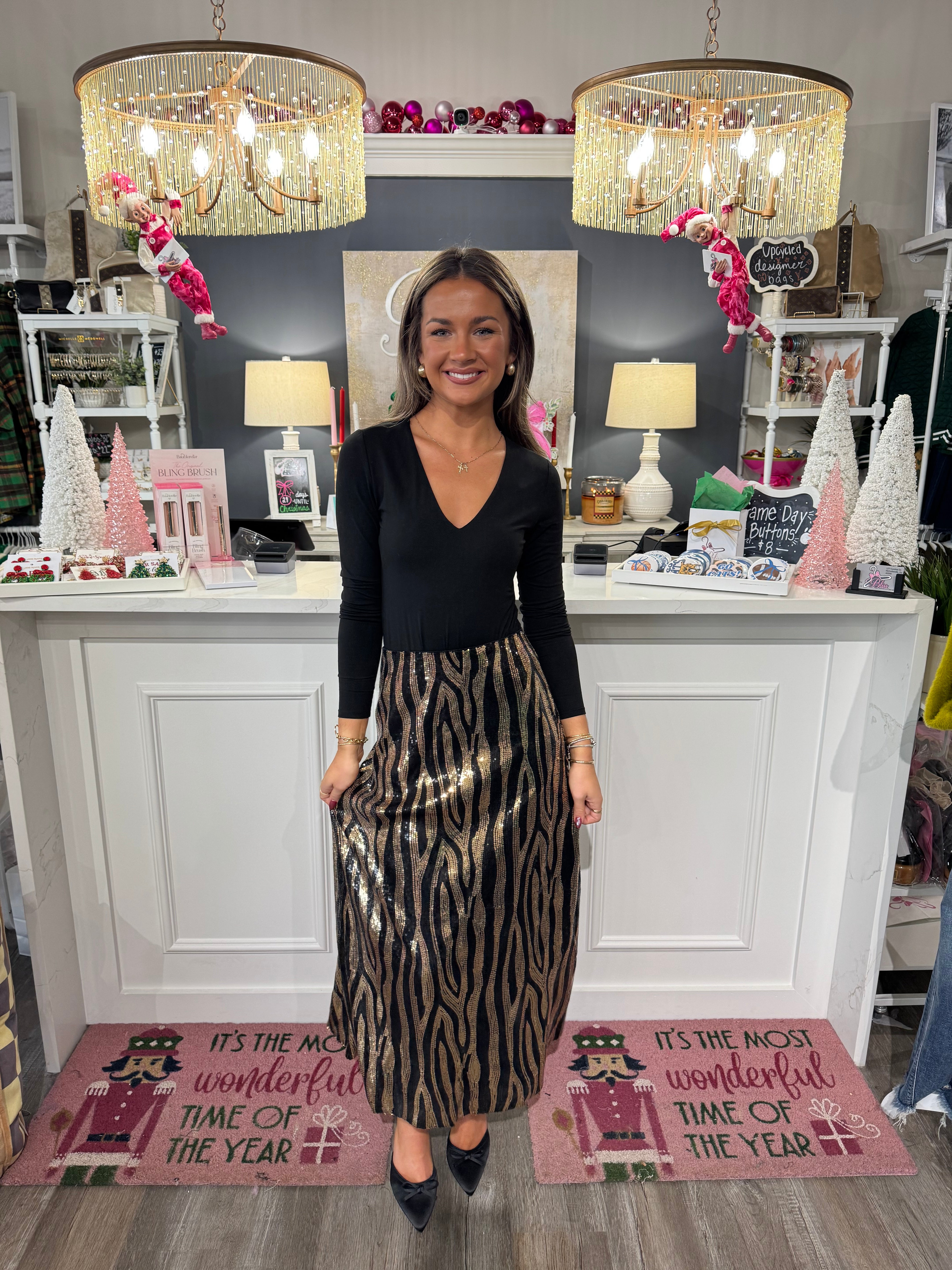 Unleash your wild side with this midi skirt by Ellison, featuring an eye-catching animal print and sparkling sequins. Perfect for adding some fun and flair to any outfit!