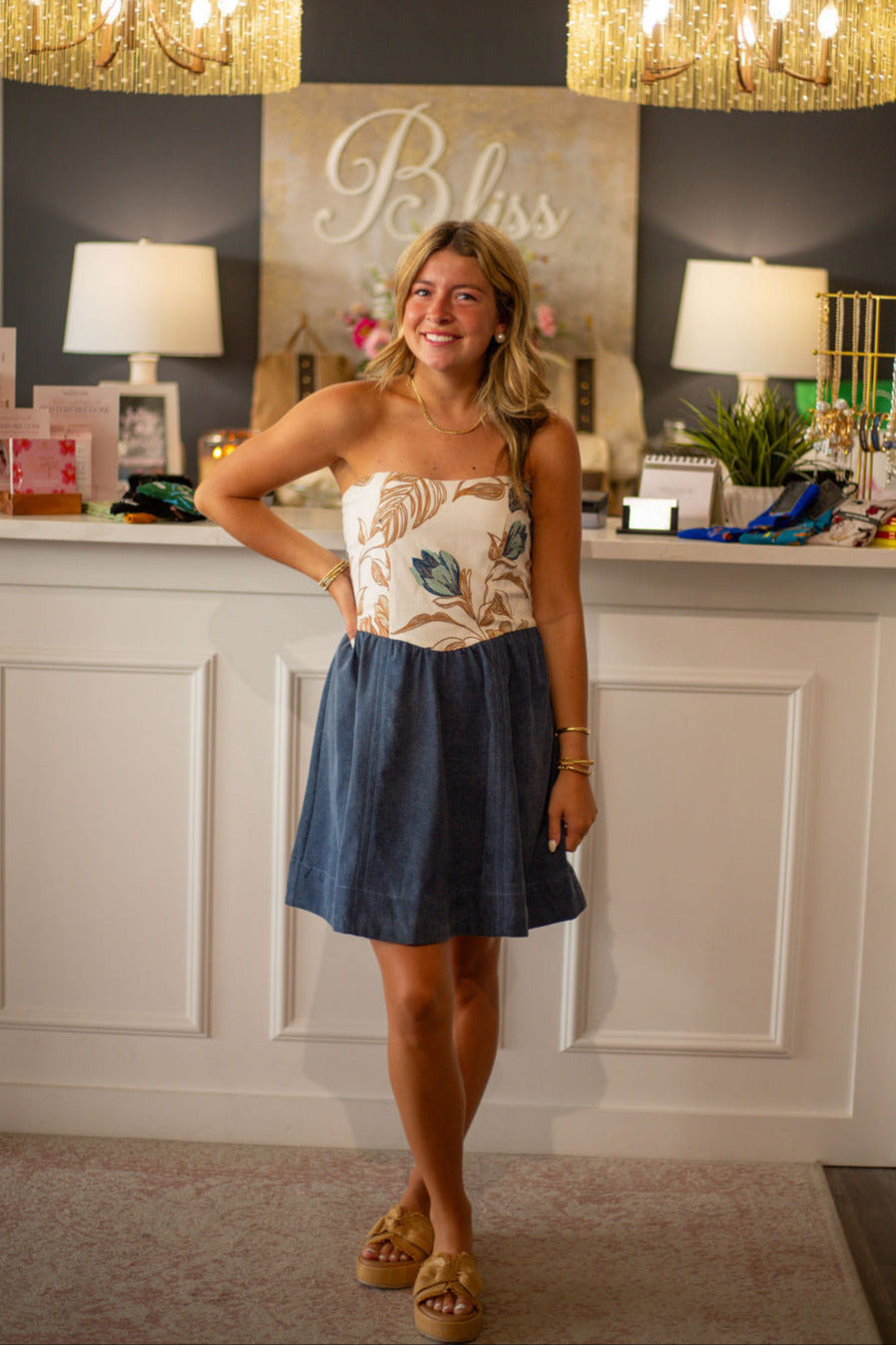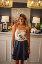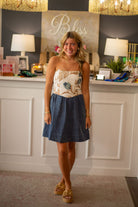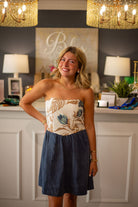 The Antibes Dress combines a fitted embroidered bodice with a subtly flared denim skirt, creating a refined yet playful silhouette. Its short length makes it versatile for both casual and dressier occasions, allowing effortless transitions from day to evening. This dress offers a polished look with a touch of charm, perfect for those seeking understated elegance with a modern edge.