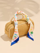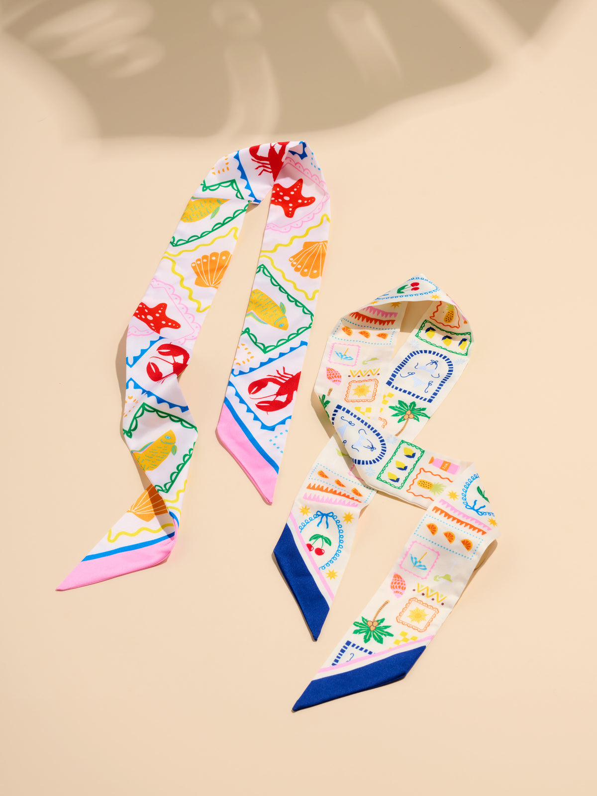 This set of two vibrant silk scarves features playful, colorful patterns with beach-inspired motifs like crabs, fish, and seashells. The bright, bold colors in a mix of reds, yellows, and blues add a cheerful touch to any outfit. These scarves can be styled in a variety of ways, from tying around the neck to wrapping them around a handbag, making them a versatile accessory for warm-weather looks. Their lightweight, smooth fabric ensures comfort while adding a fun, whimsical flair to your ensemble.