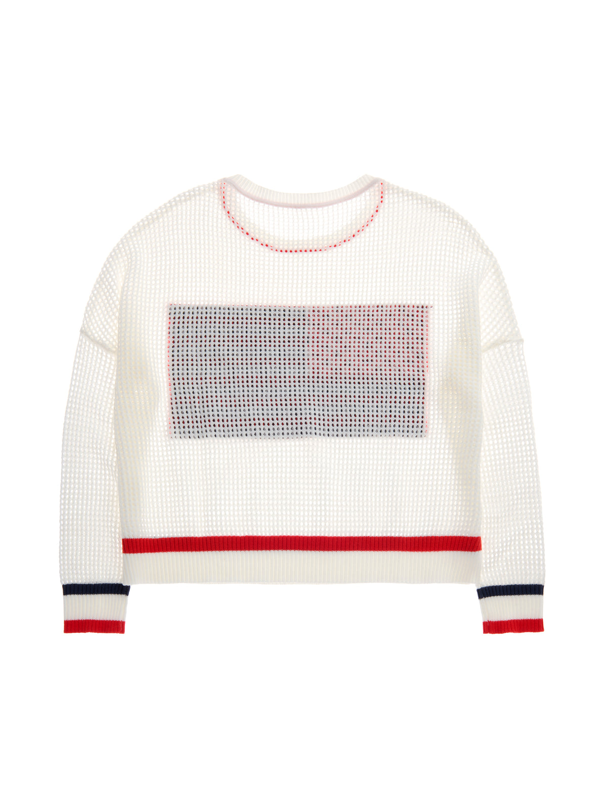 This stylish crewneck sweater features a lightweight, open-knit texture that provides a modern and breathable feel for year-round wear. A bold flag graphic serves as a classic centerpiece, while sporty striped detailing on the cuffs and hem adds a polished, athletic finish to the relaxed silhouette. Designed with a comfortable drop-shoulder fit, this piece effortlessly pairs with your favorite denim or leggings for an easygoing yet patriotic look. Its soft construction ensures all-day comfort, making it a versatile addition to any casual wardrobe.