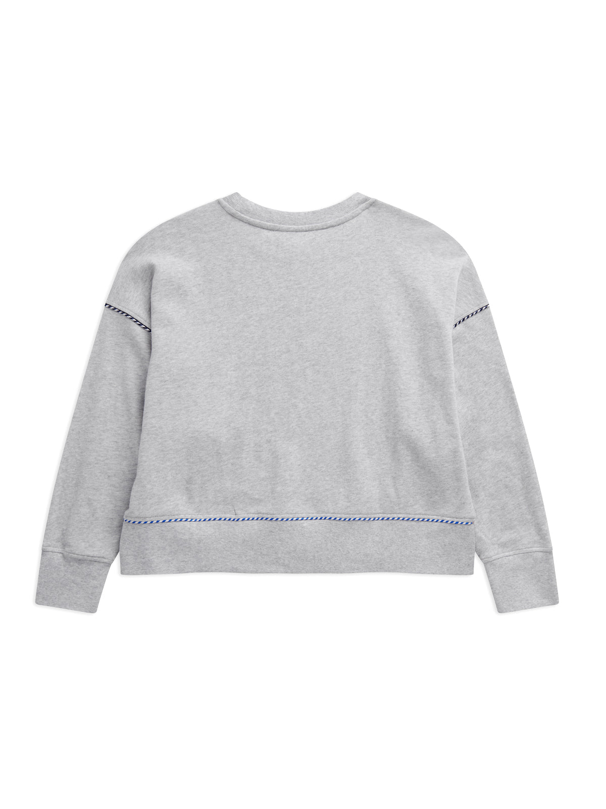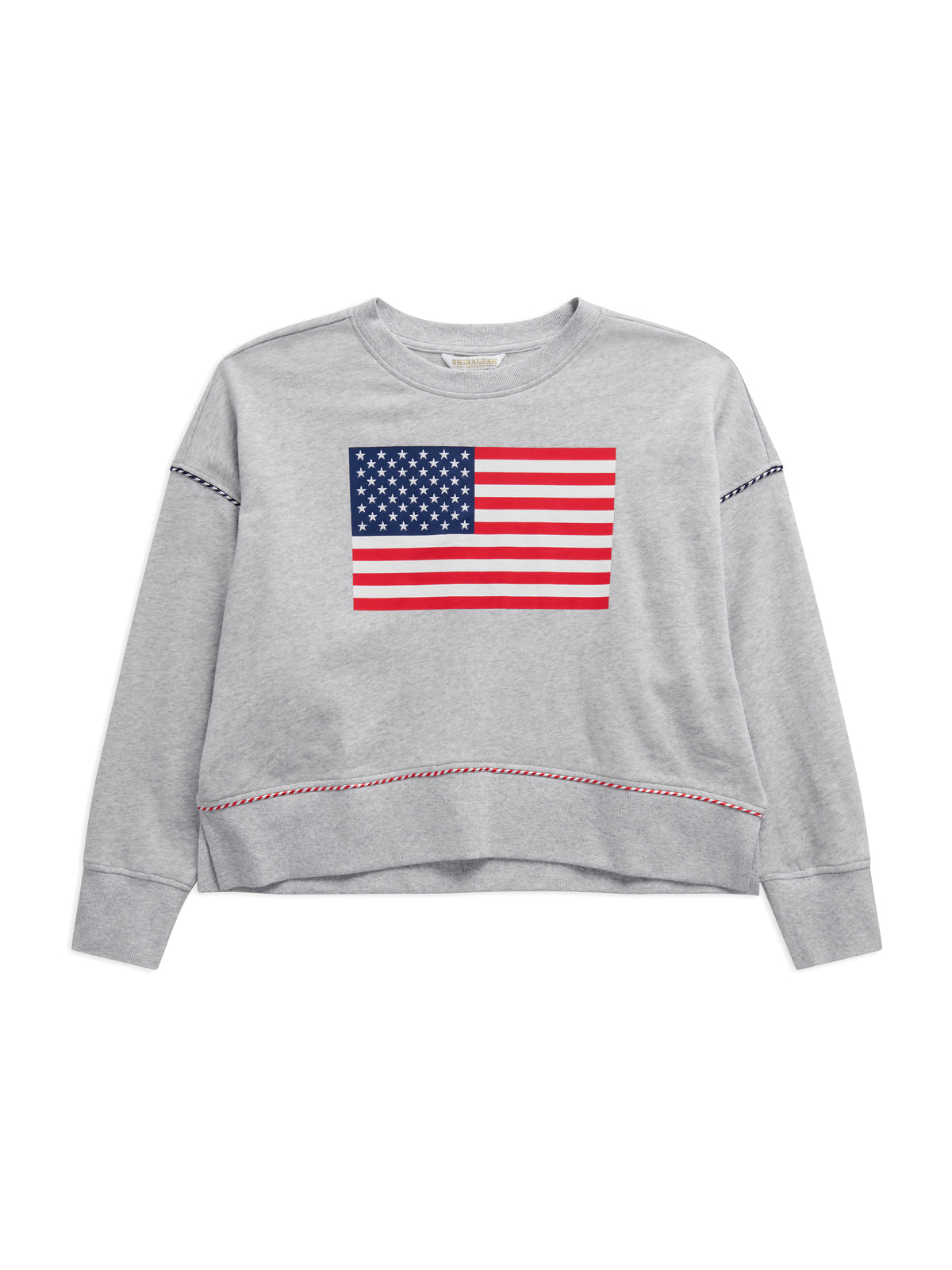 This relaxed, cropped sweatshirt features a classic crew neckline and dropped shoulders for a comfortable, modern fit. The center is detailed with a bold American flag graphic, complemented by patriotic red, white, and blue twisted piping along the sleeve seams and hem. Perfect for tossing on during a breezy afternoon or at a holiday gathering, it pairs effortlessly with denim for a spirited yet casual look.