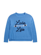 This stylish knit sweater features a comfortable, relaxed fit with dropped shoulders and a classic crew neckline. The chest is detailed with a dark navy "Lake Life" script and an embroidered oar graphic, bringing a touch of nautical charm to your weekend wardrobe. Finished with thick ribbed trim at the cuffs and a side-slit hem, it is the perfect cozy layer for breezy days spent by the water.